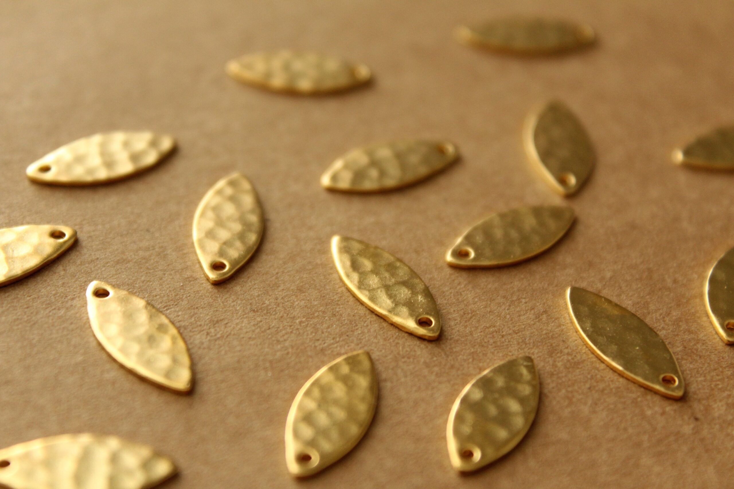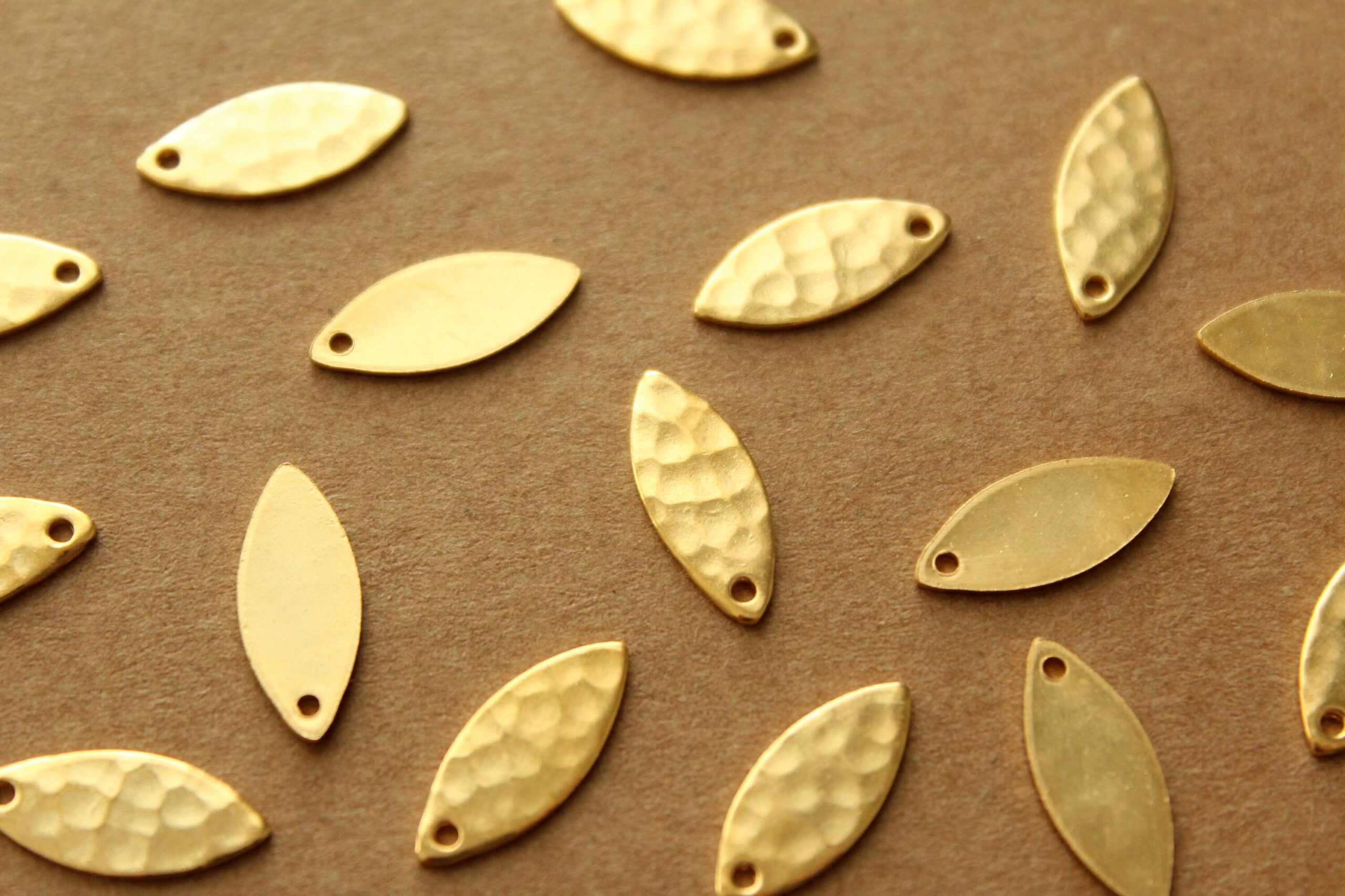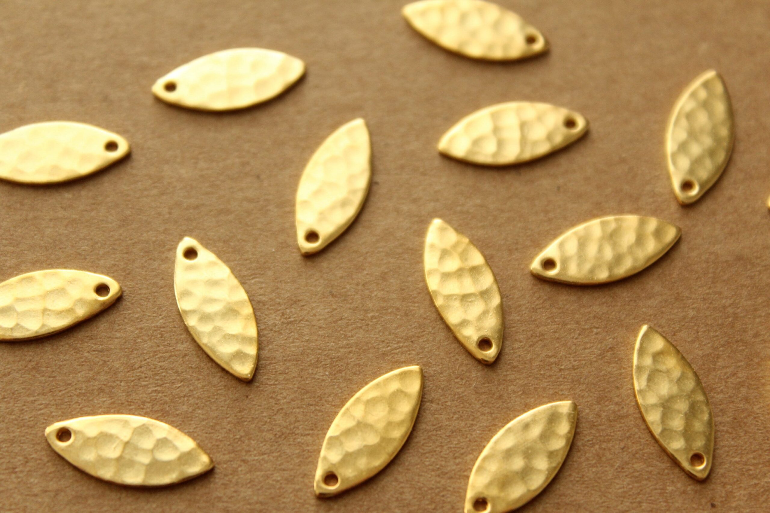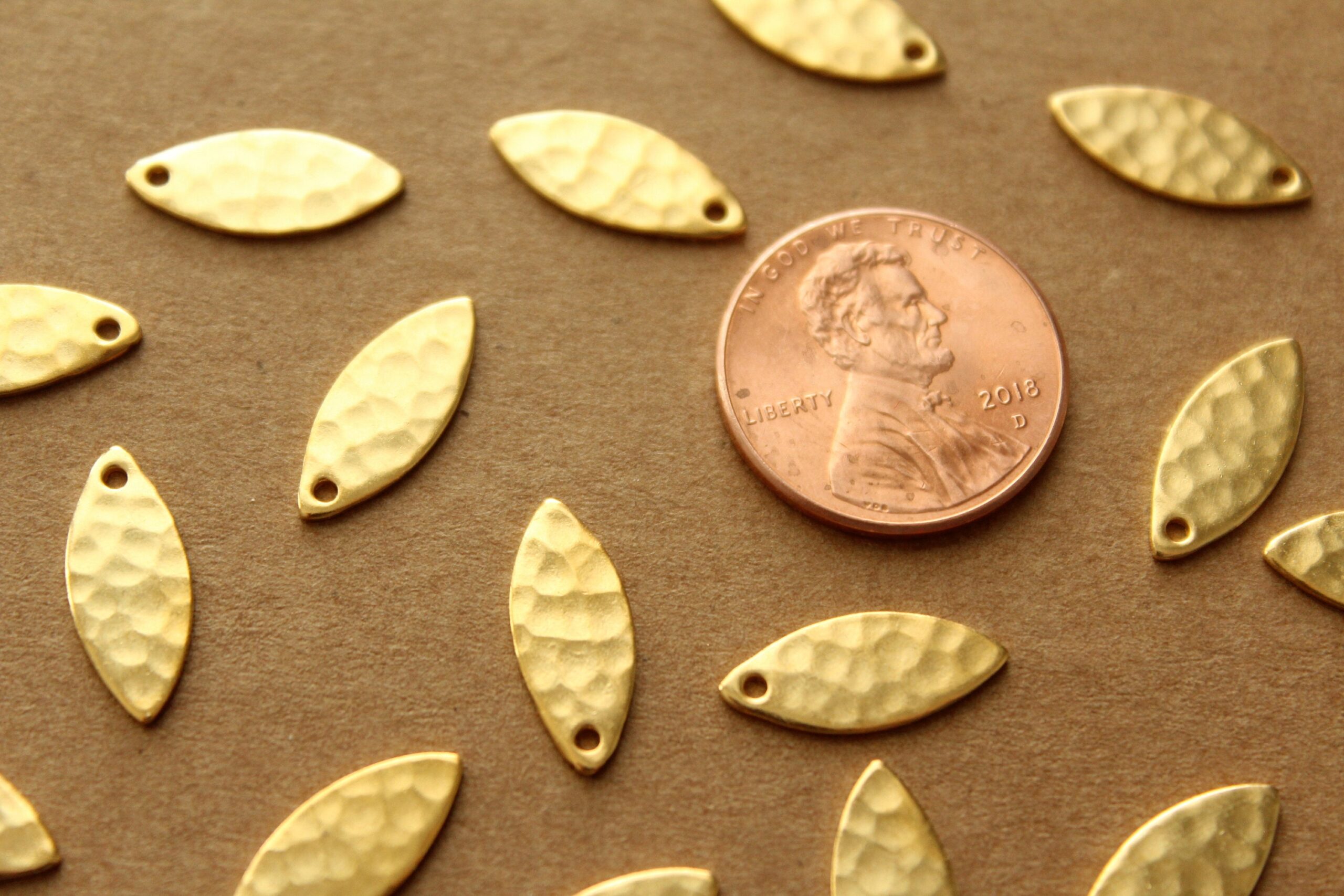 Small brass hammered marquis shaped charms with flat backs made in the USA. They have one hole.