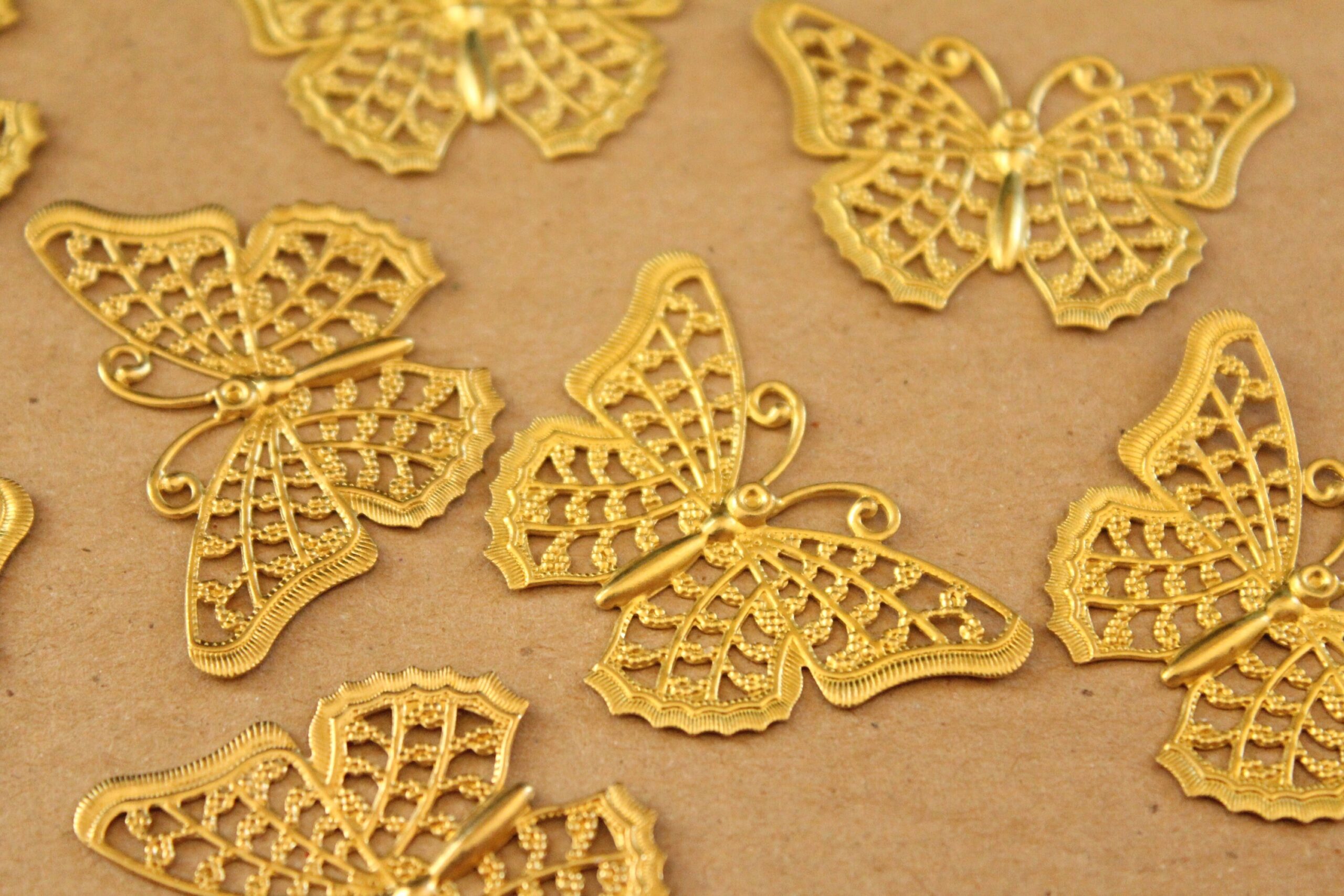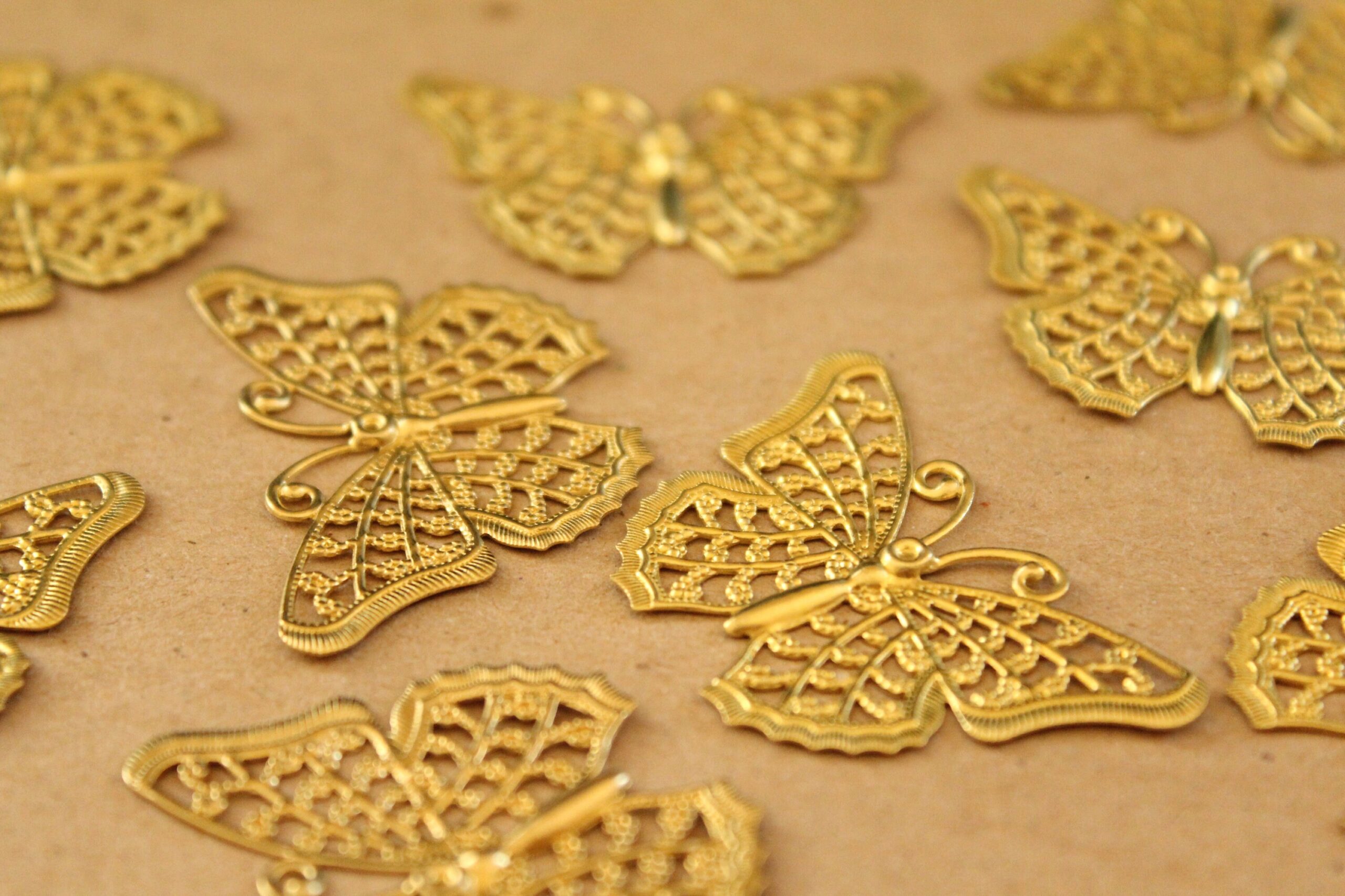Raw brass butterfly-shaped filigree stampings with hollow backs made in the USA.