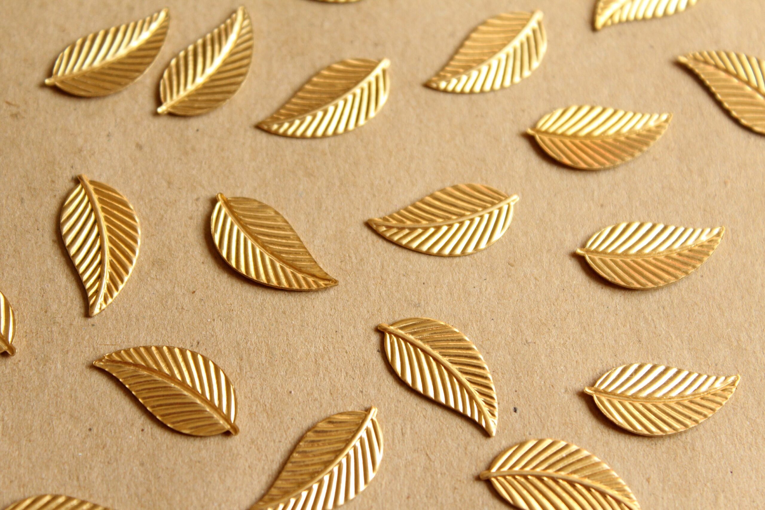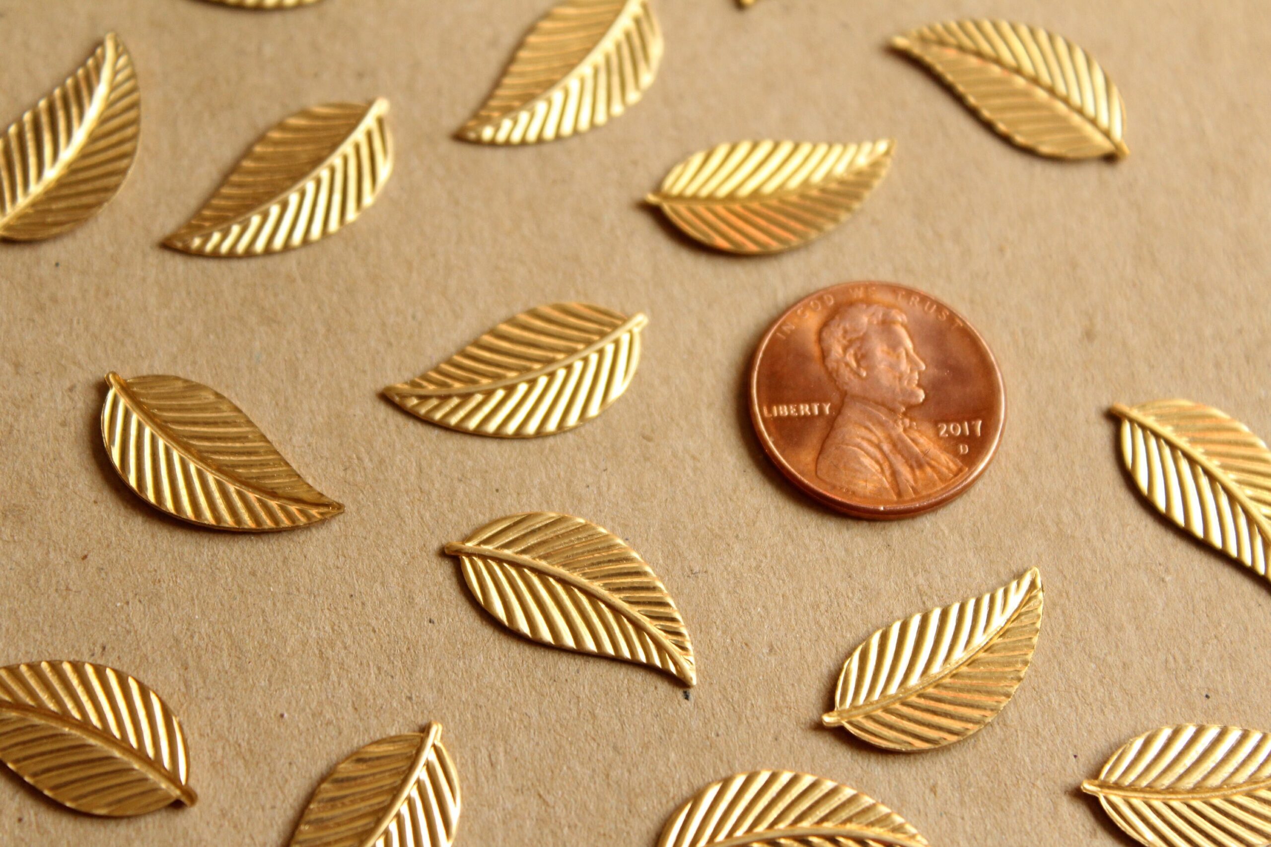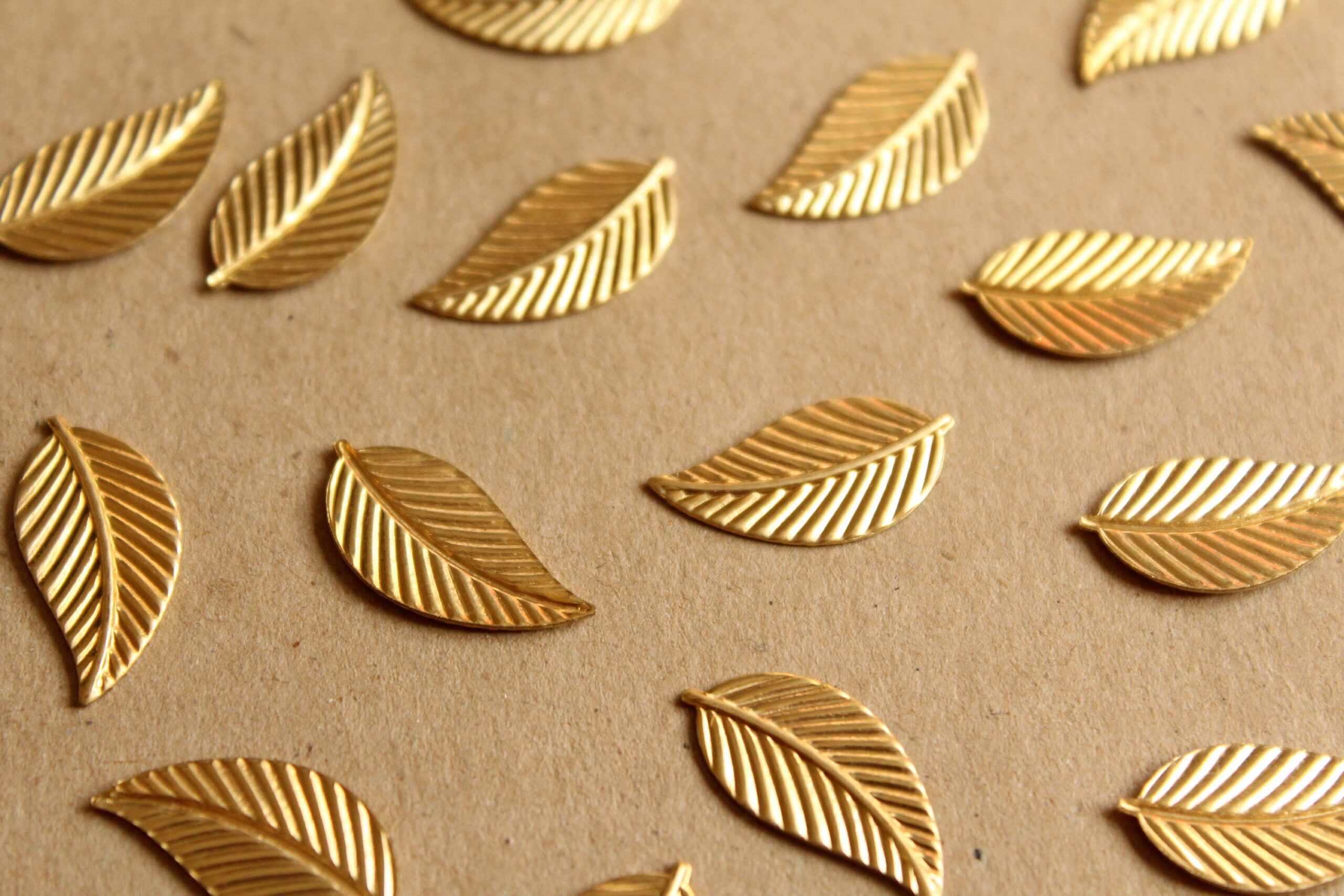 Medium raw brass veined leaf stampings with flat hollow backs made in the USA.