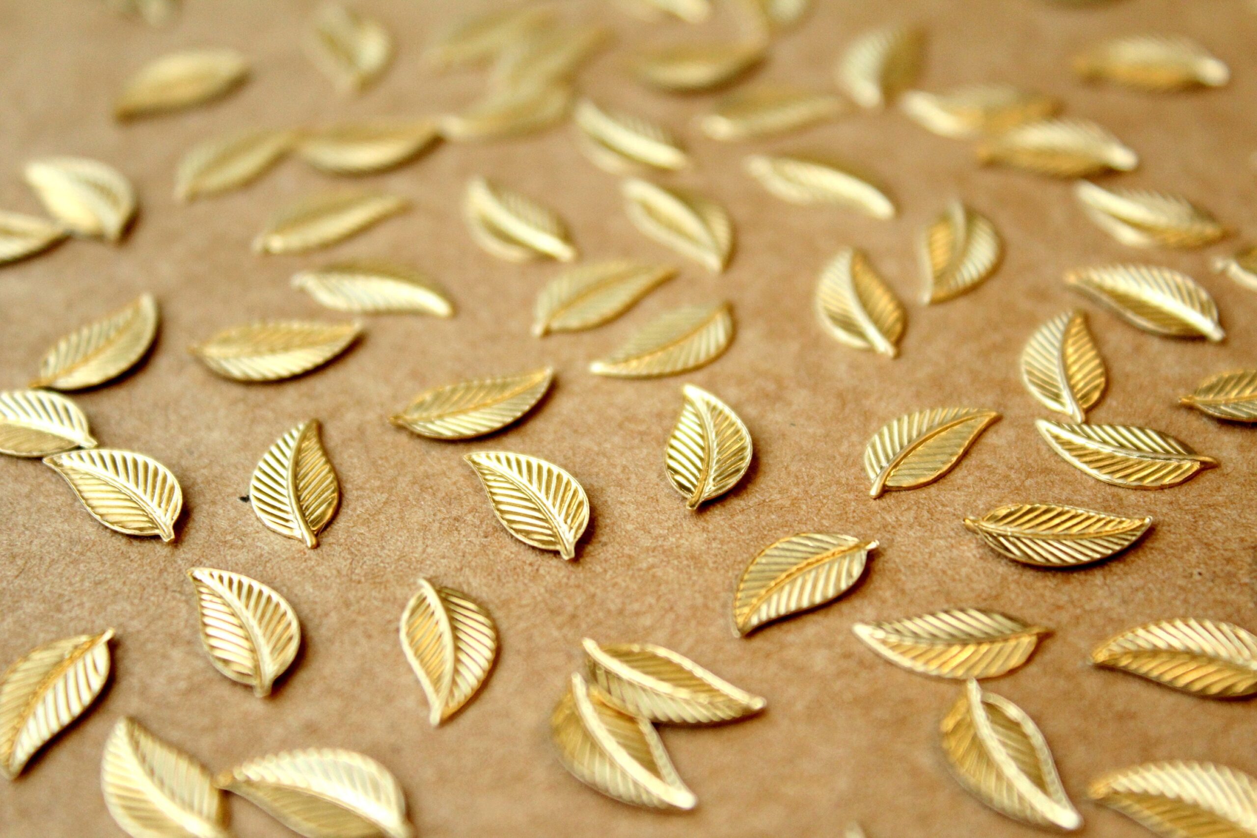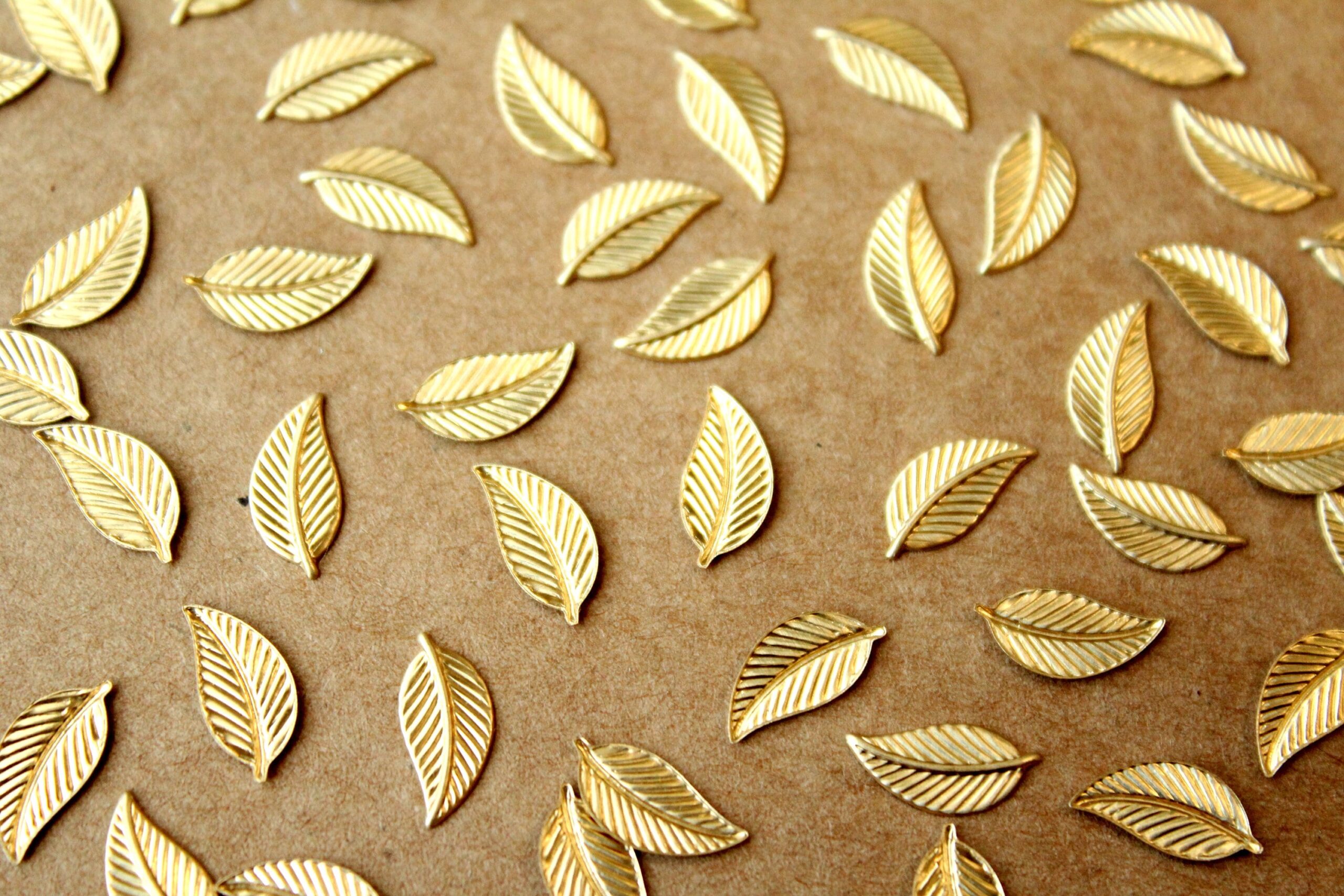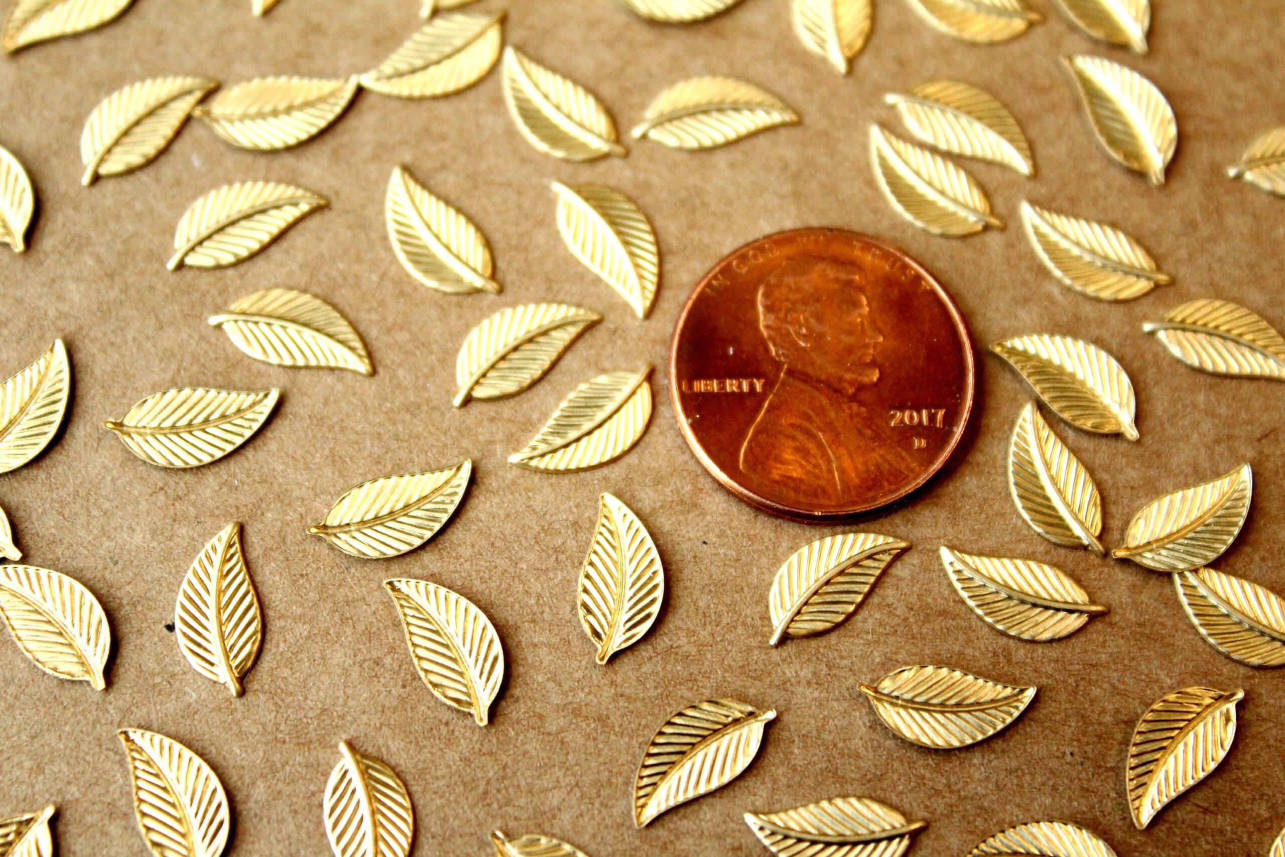 Small raw brass veined leaf stampings with flat hollow backs made in the USA. These are the mirror opposite of RB-226.