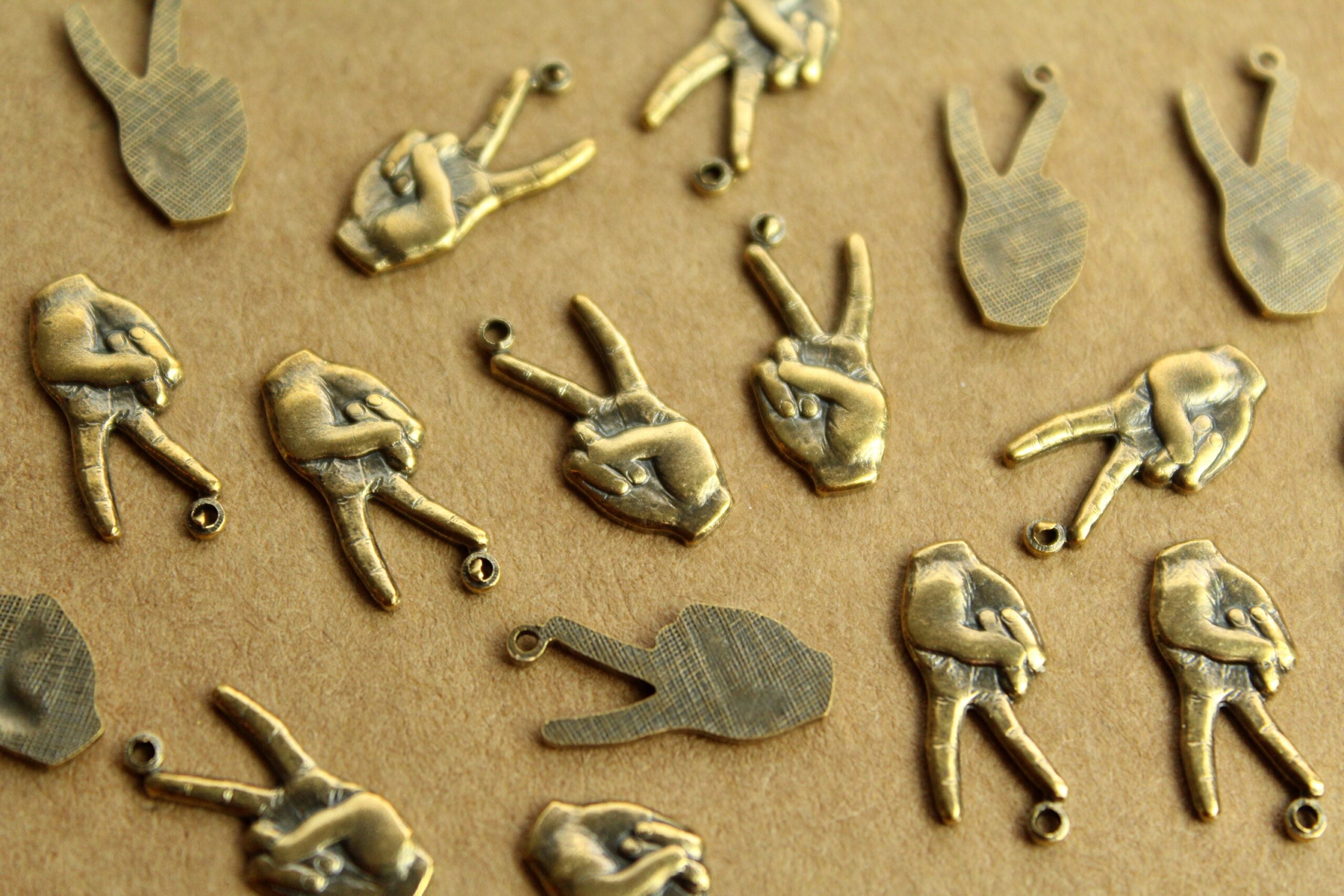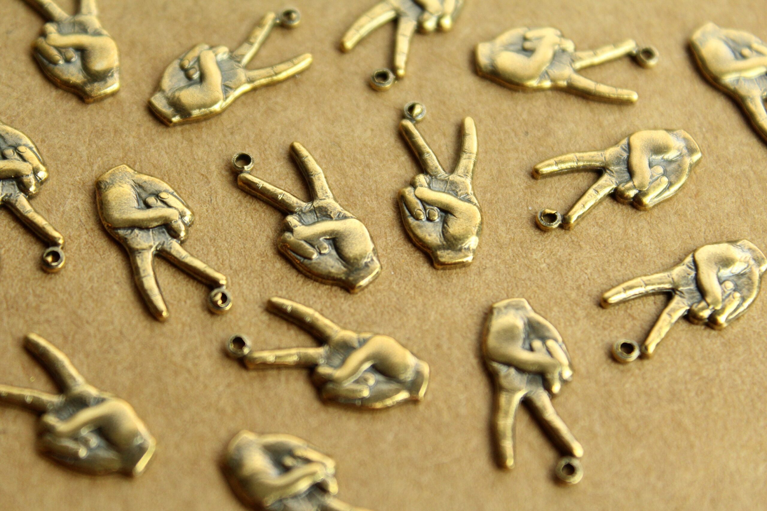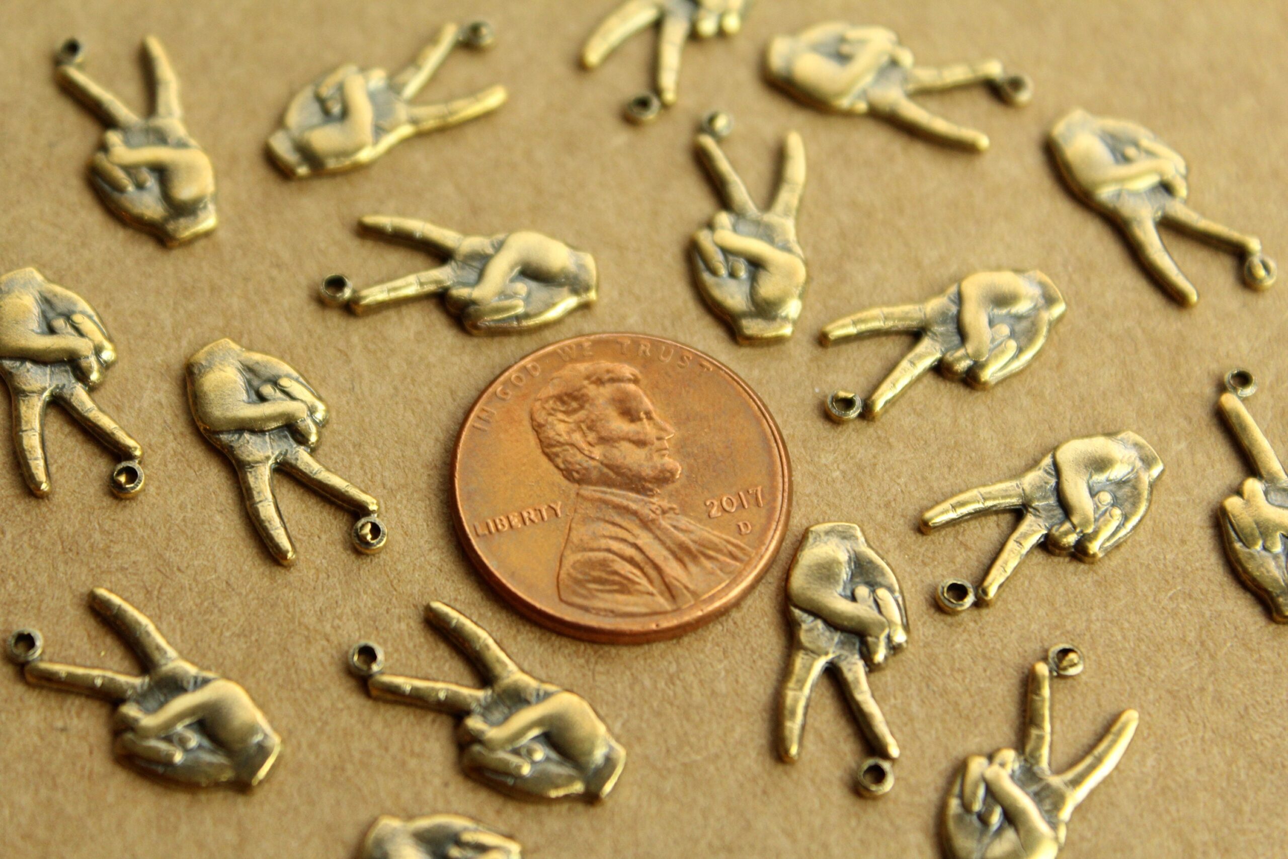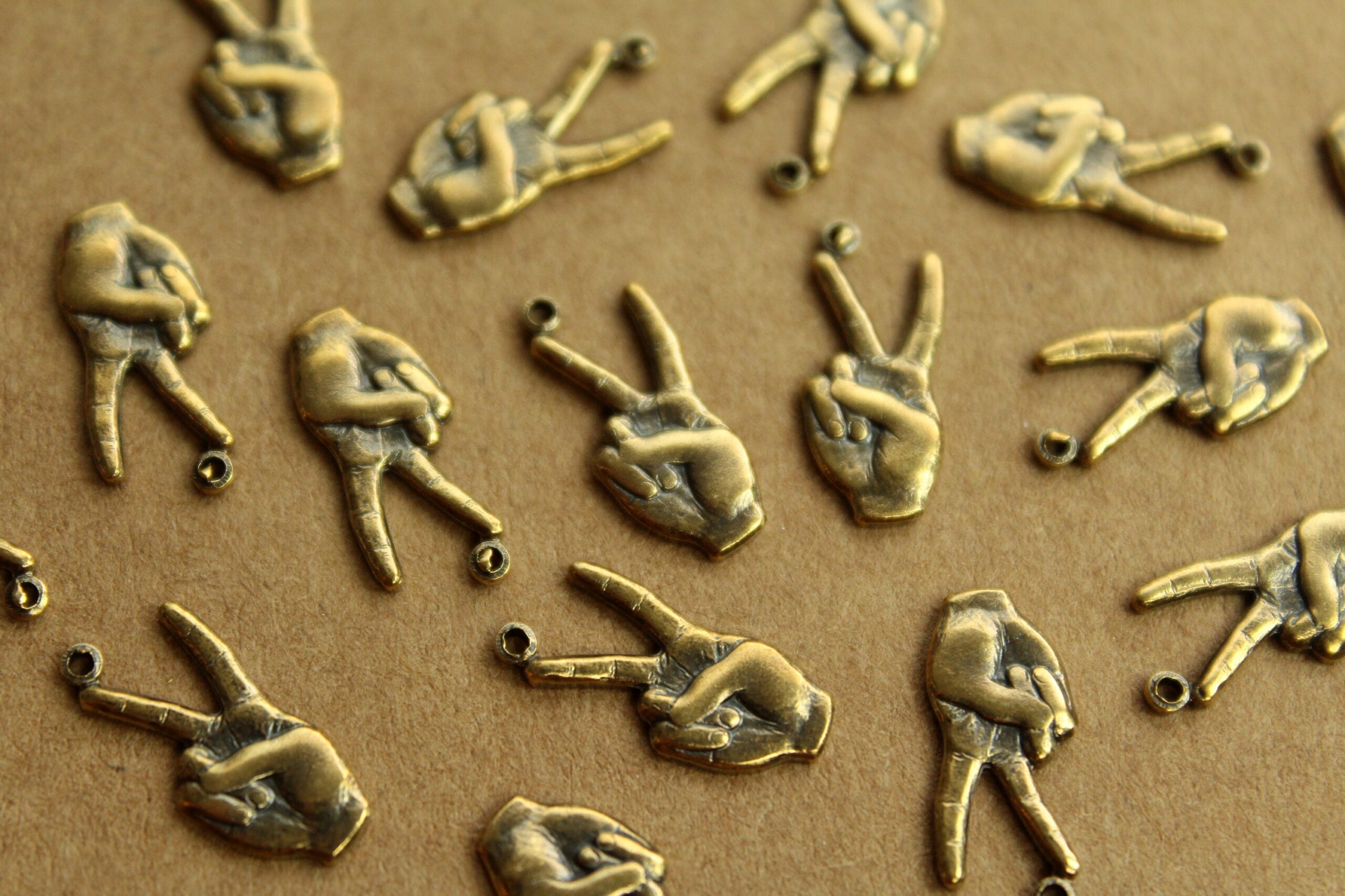 2 pc. Antique Brass Plated Peace Symbol Charms – Hand Sign for Peace : 7mm by 16mm – made in USA | AB-218