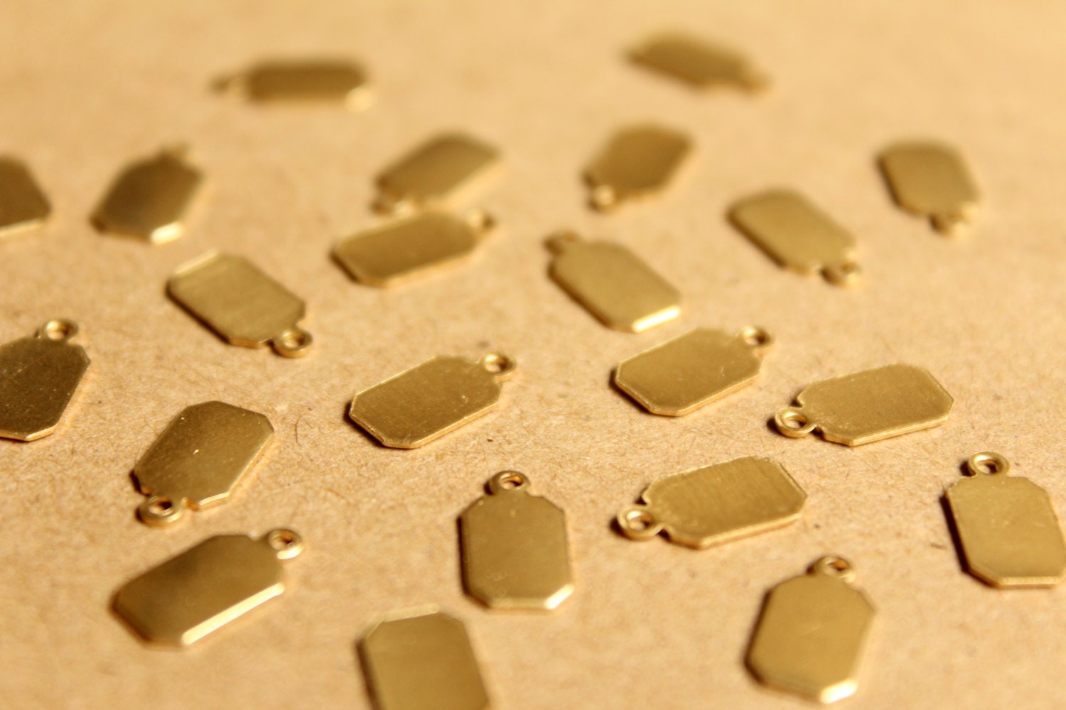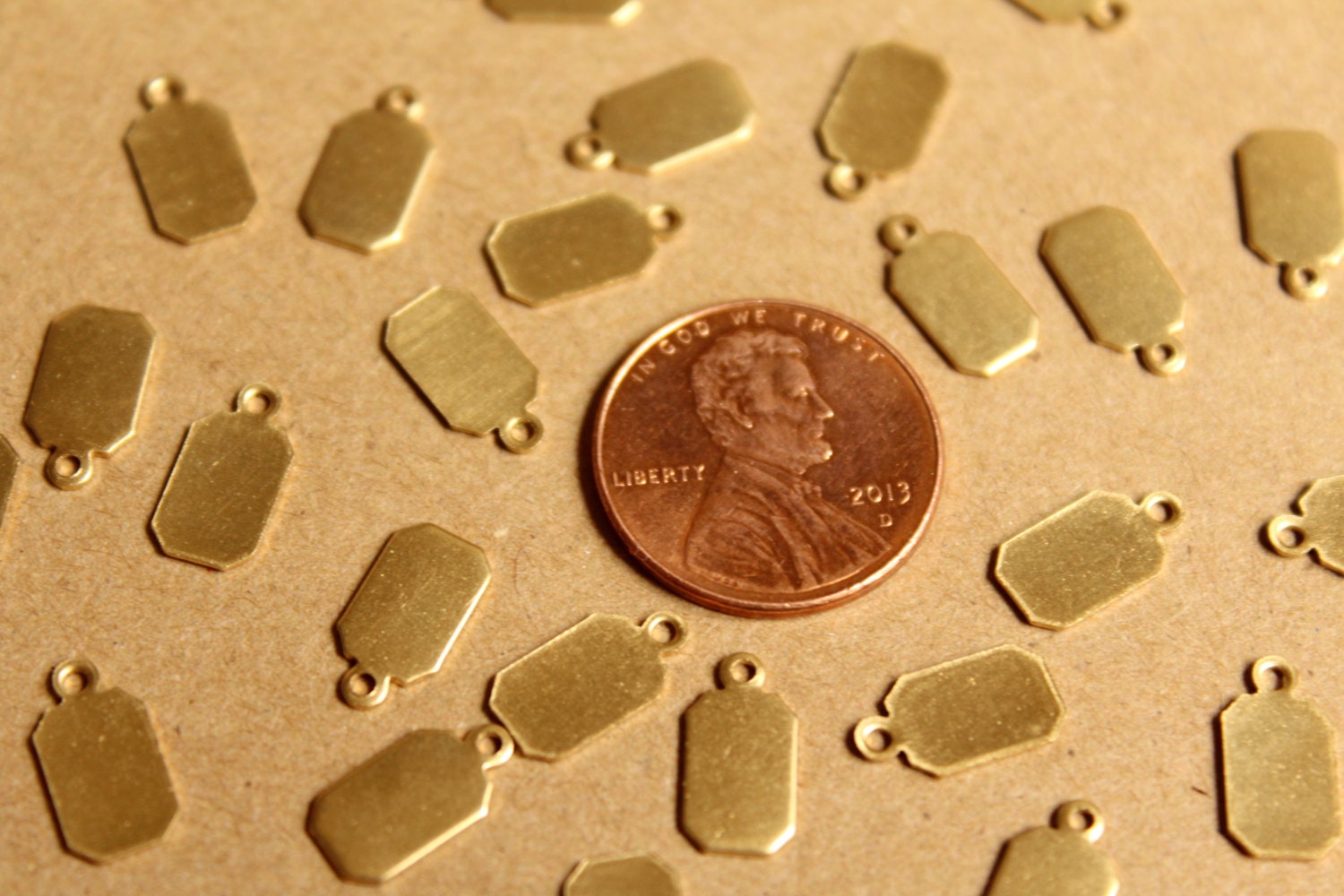 Small raw brass stamping charms with flat backs and one loop, made in the USA.