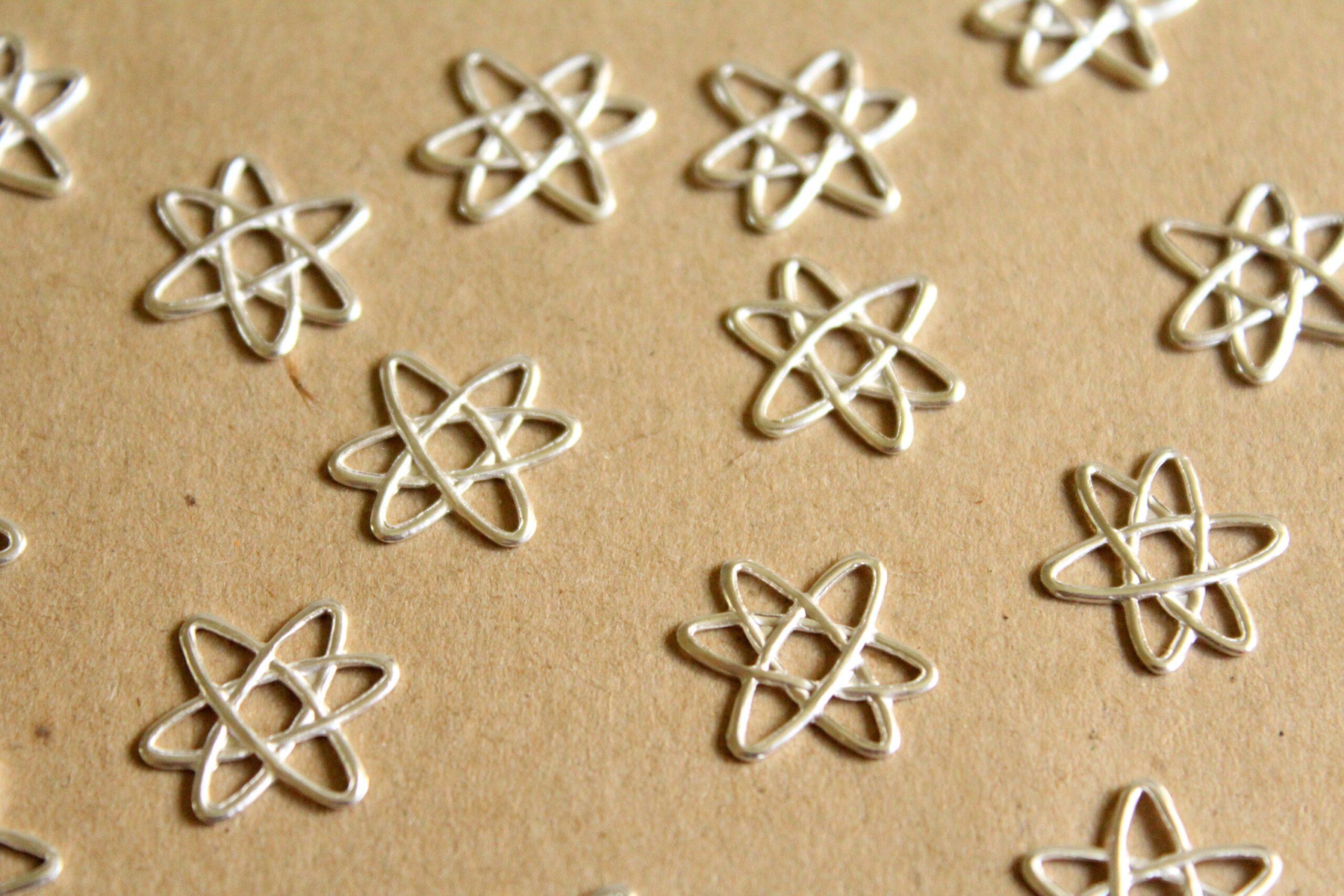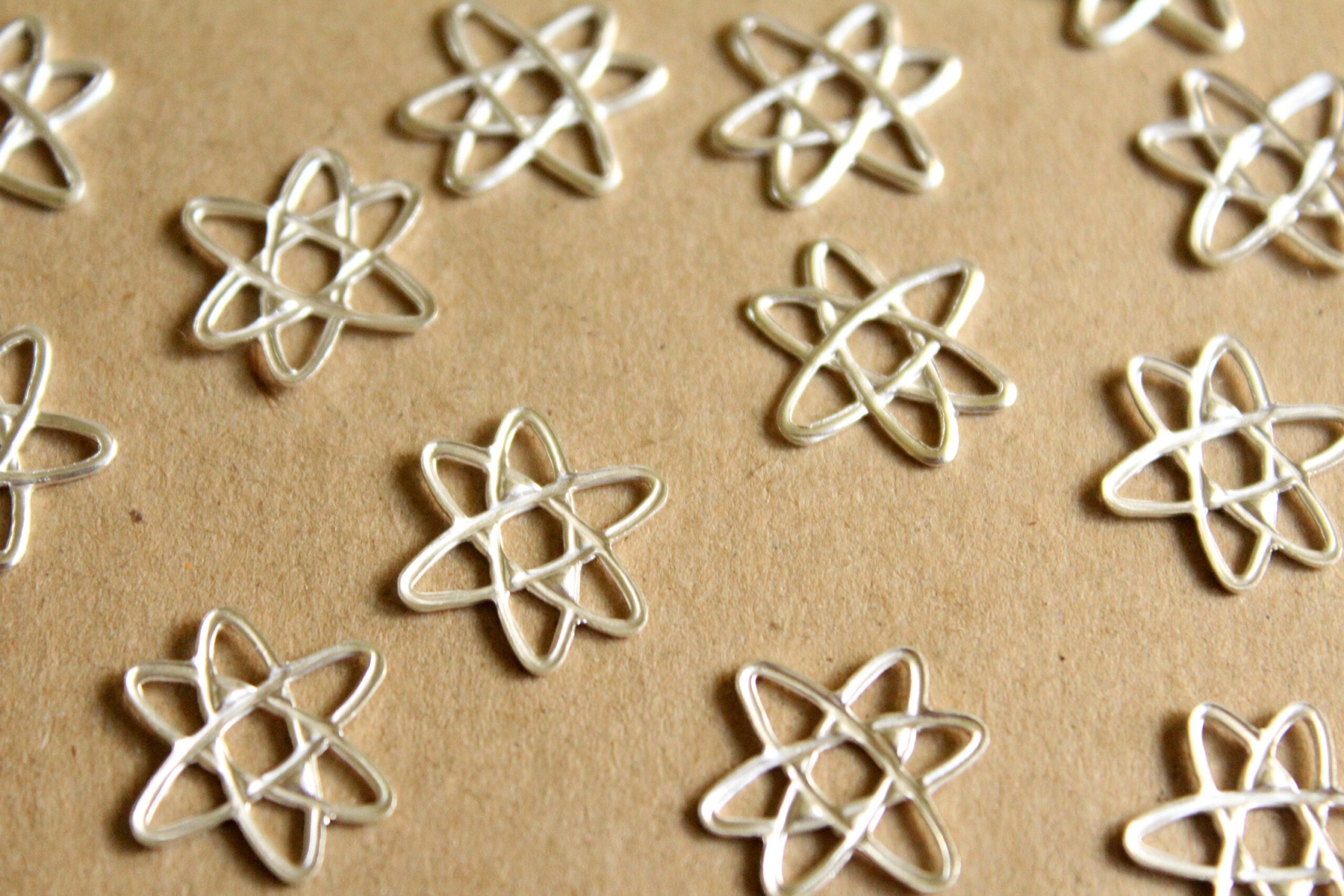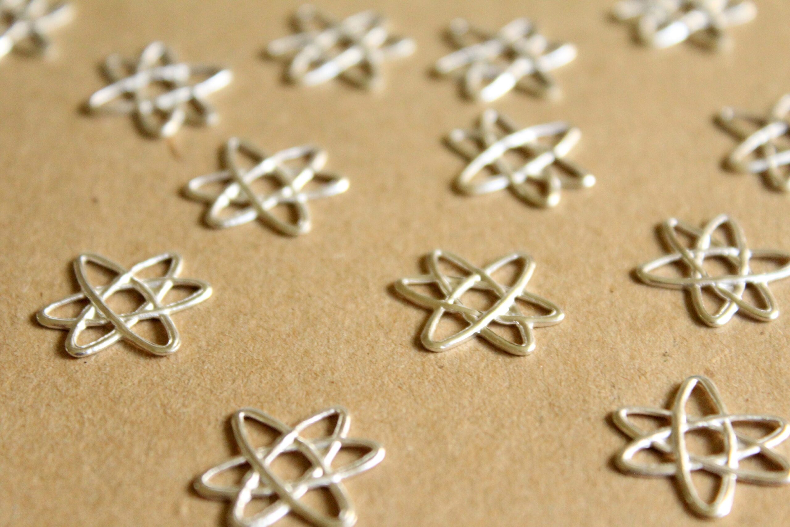 Brass electrons stampings with hollow backs, made in the USA. These are the silver plated version of RB-847.