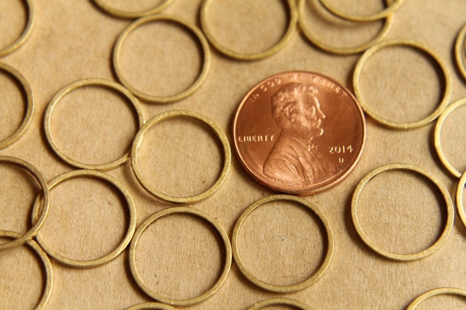 Raw, unplated brass circle links. These could be connected to make chain or used in a variety of other uses.