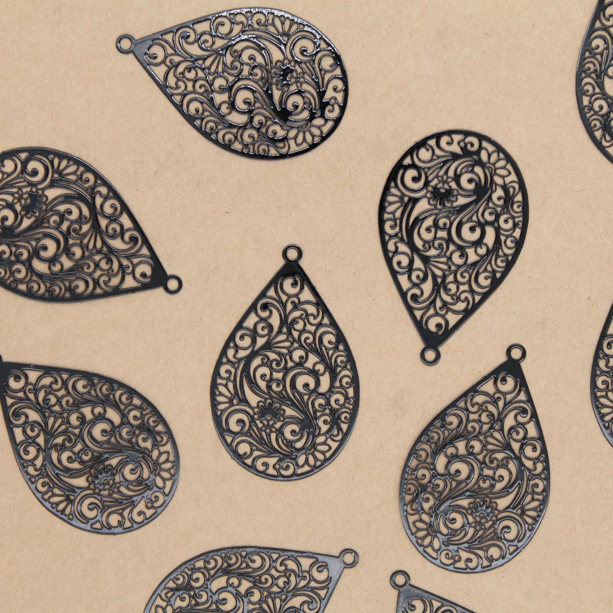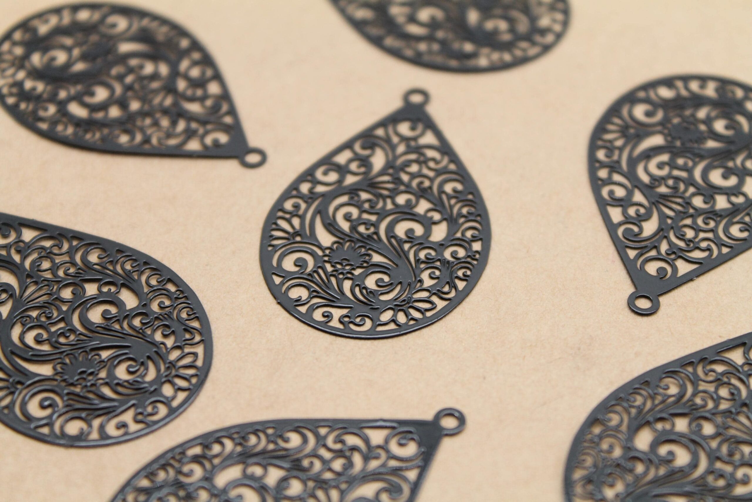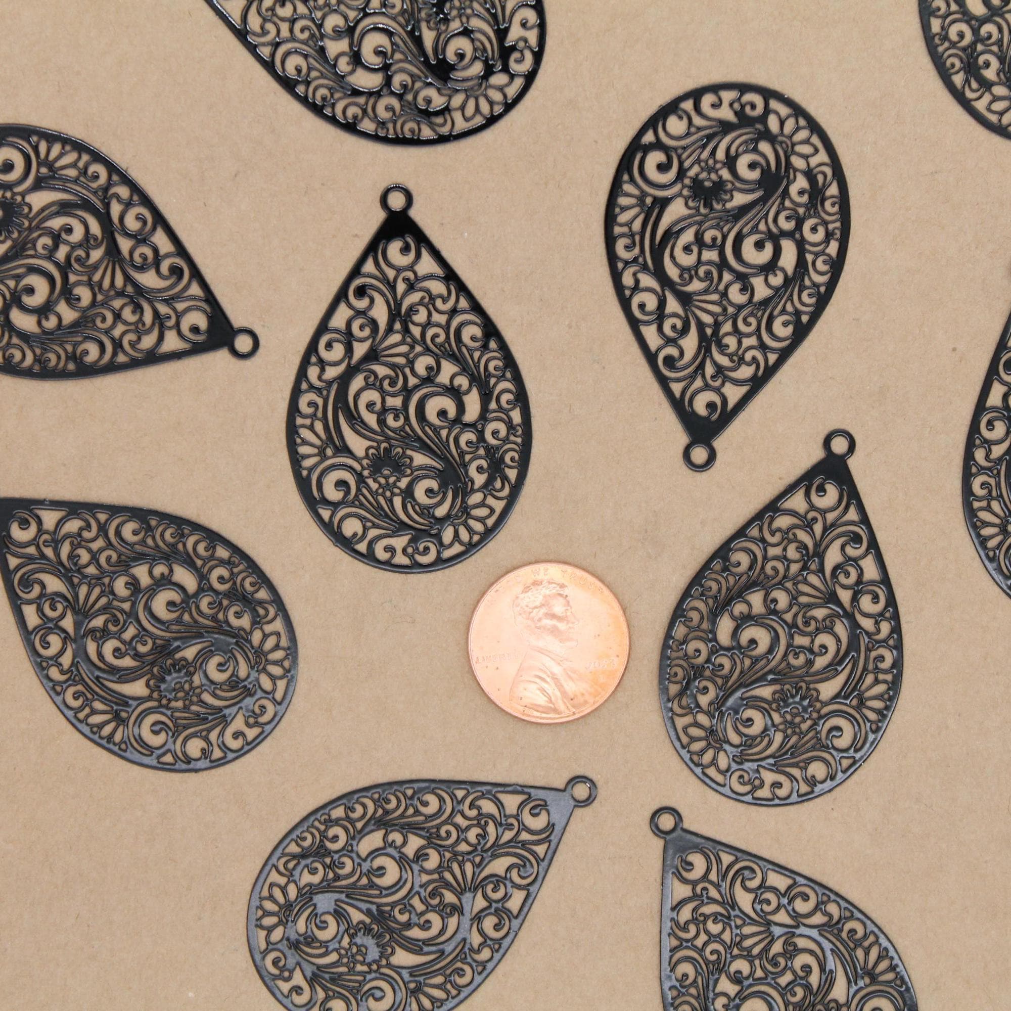 Black Painted Stainless Steel Filigree Teardrop Charms, Floral Cutouts