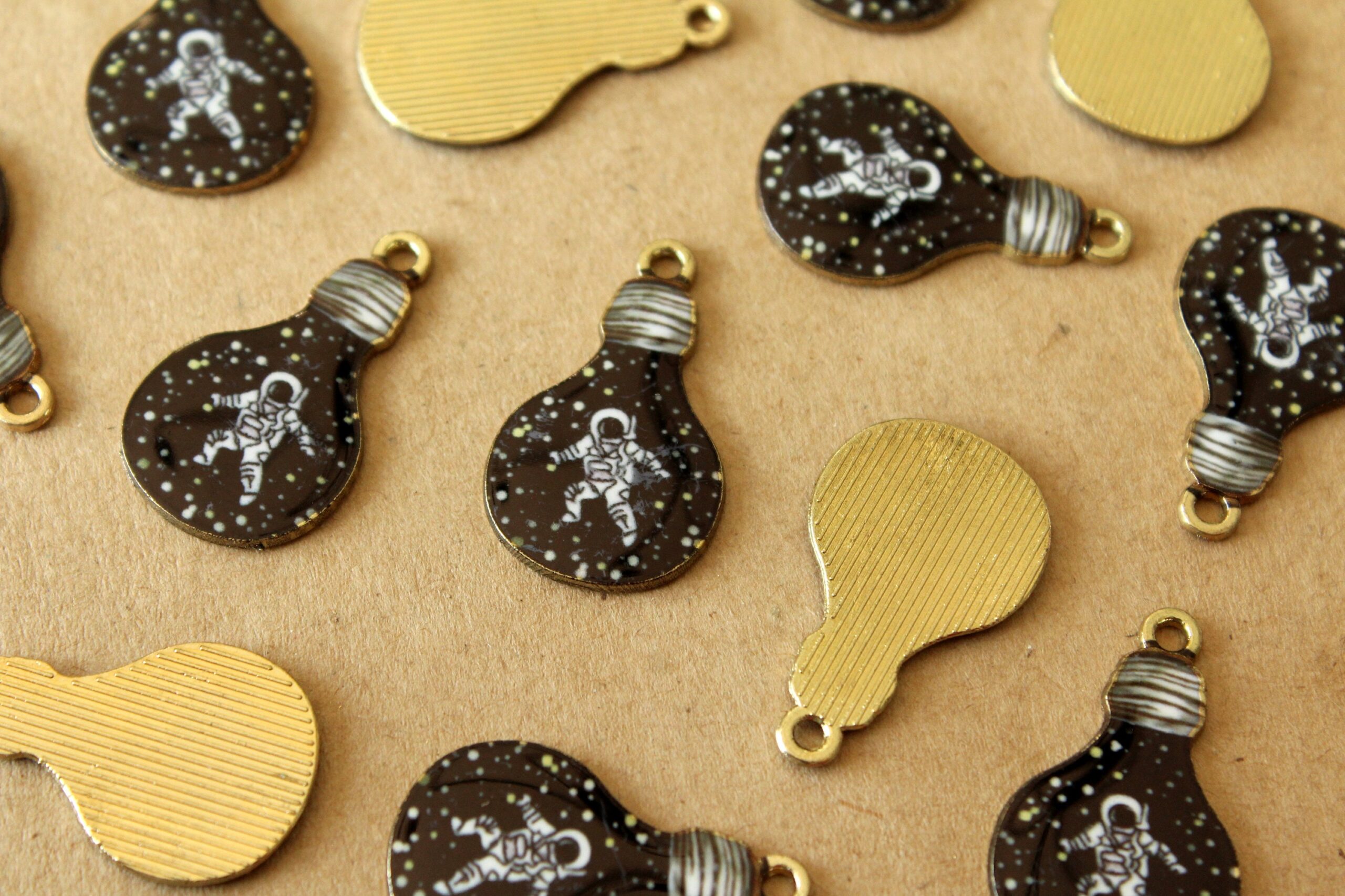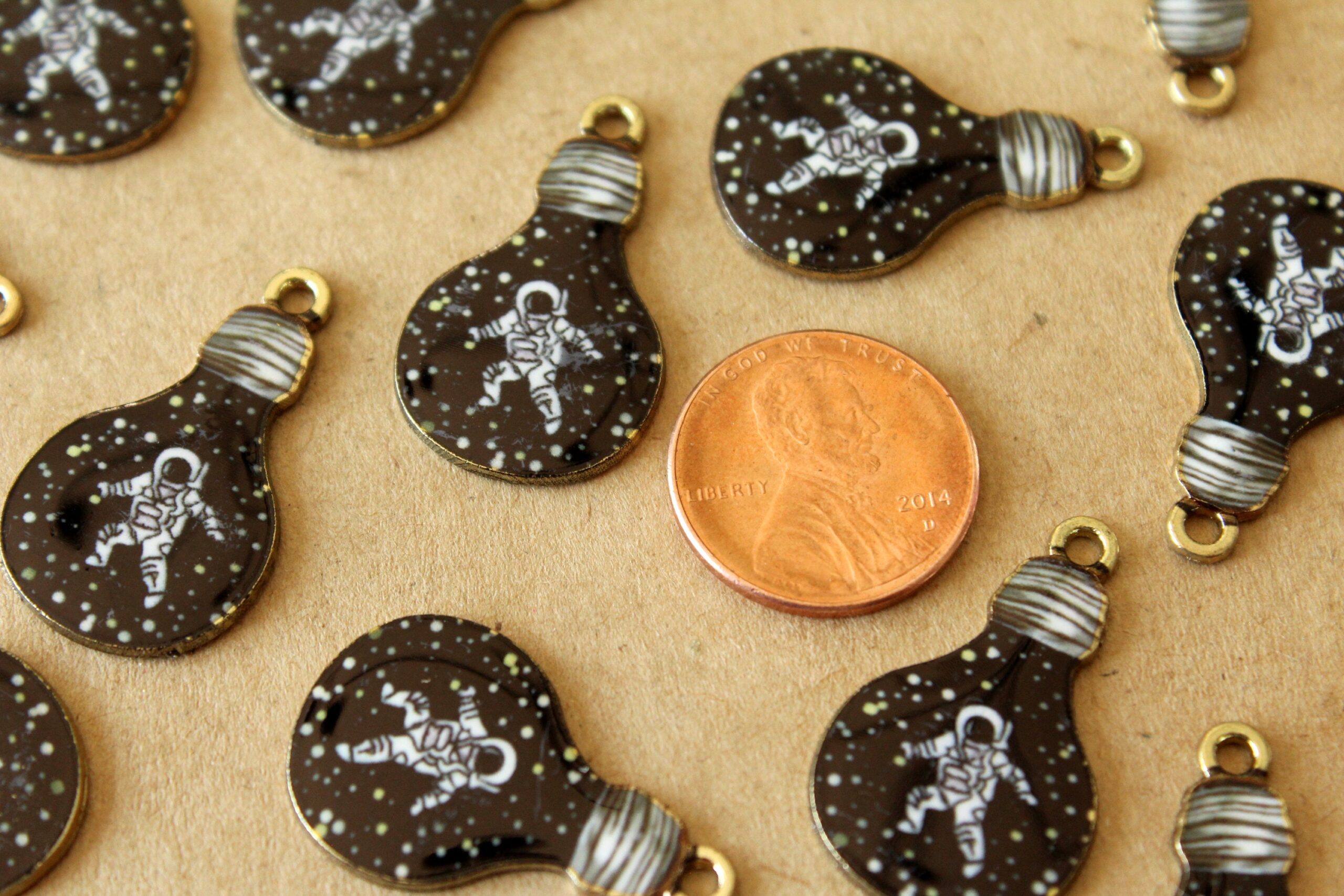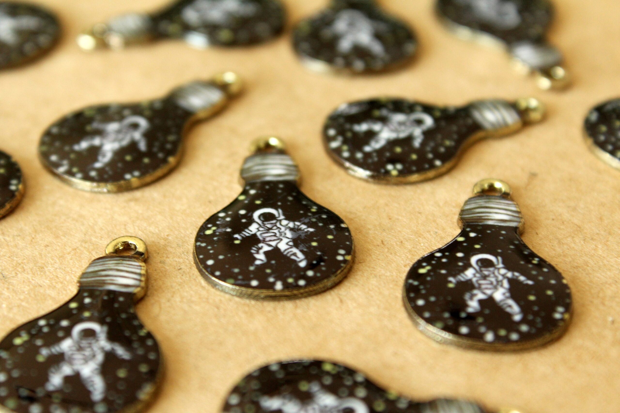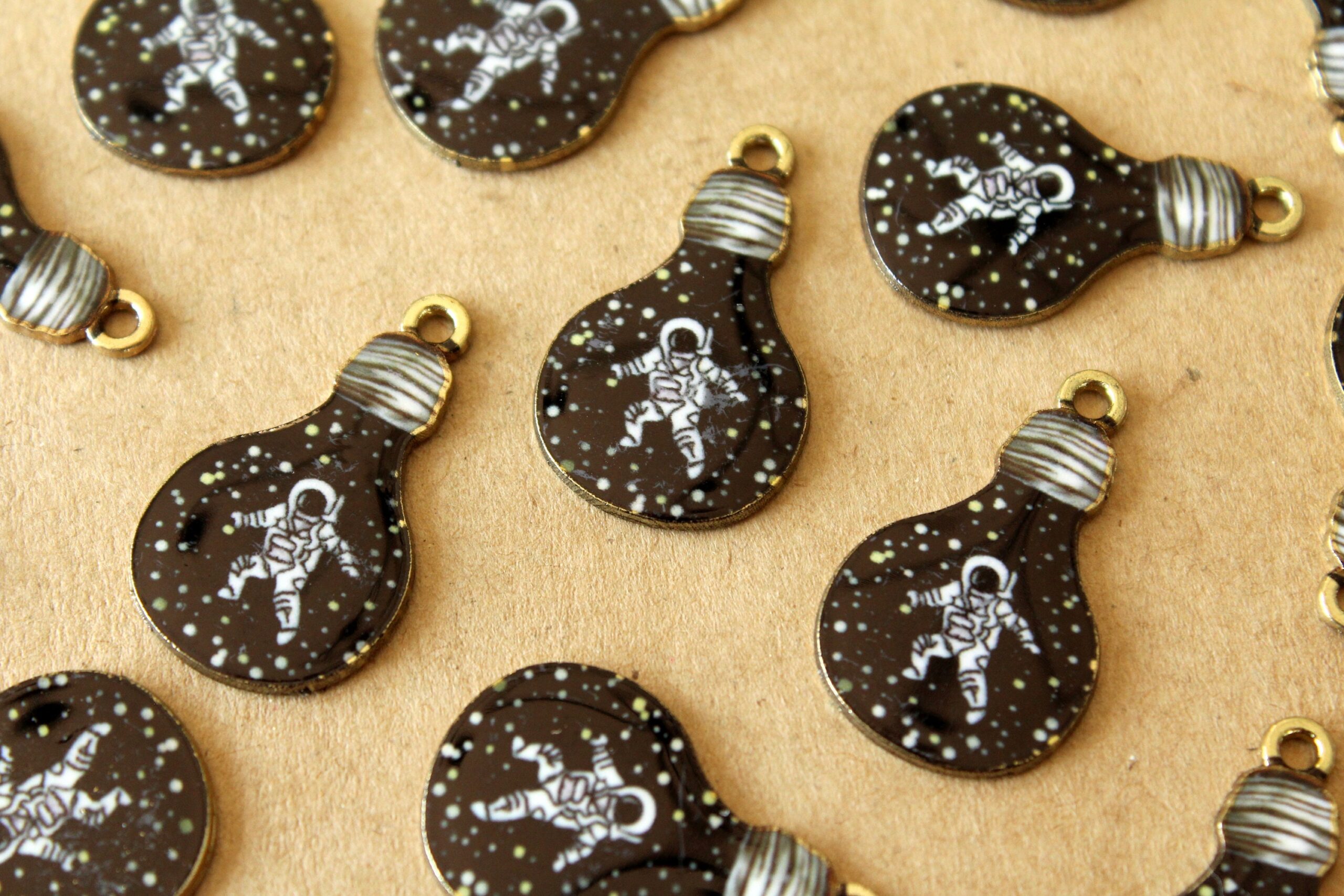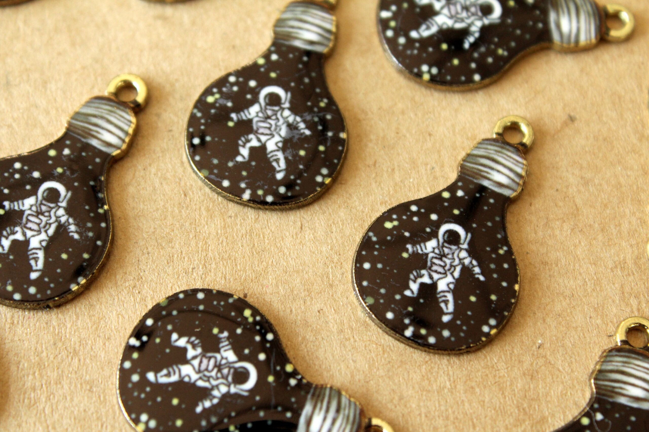 Enameled light bulb charms containing an astronaut surrounded by space.