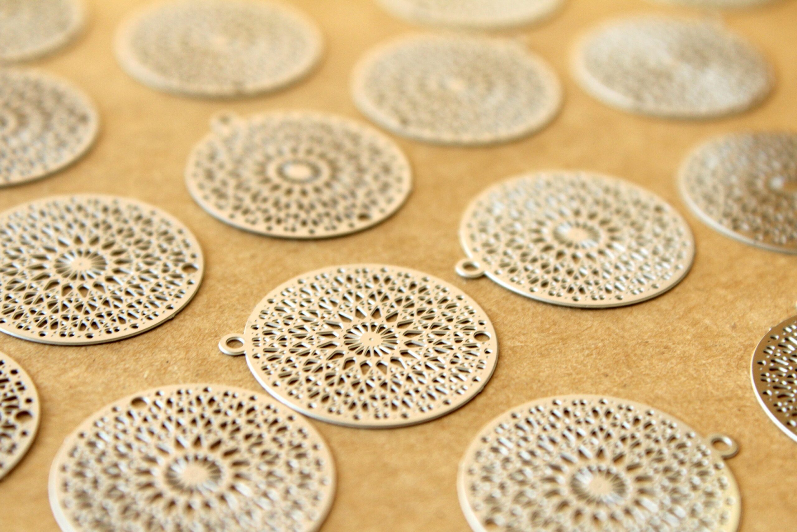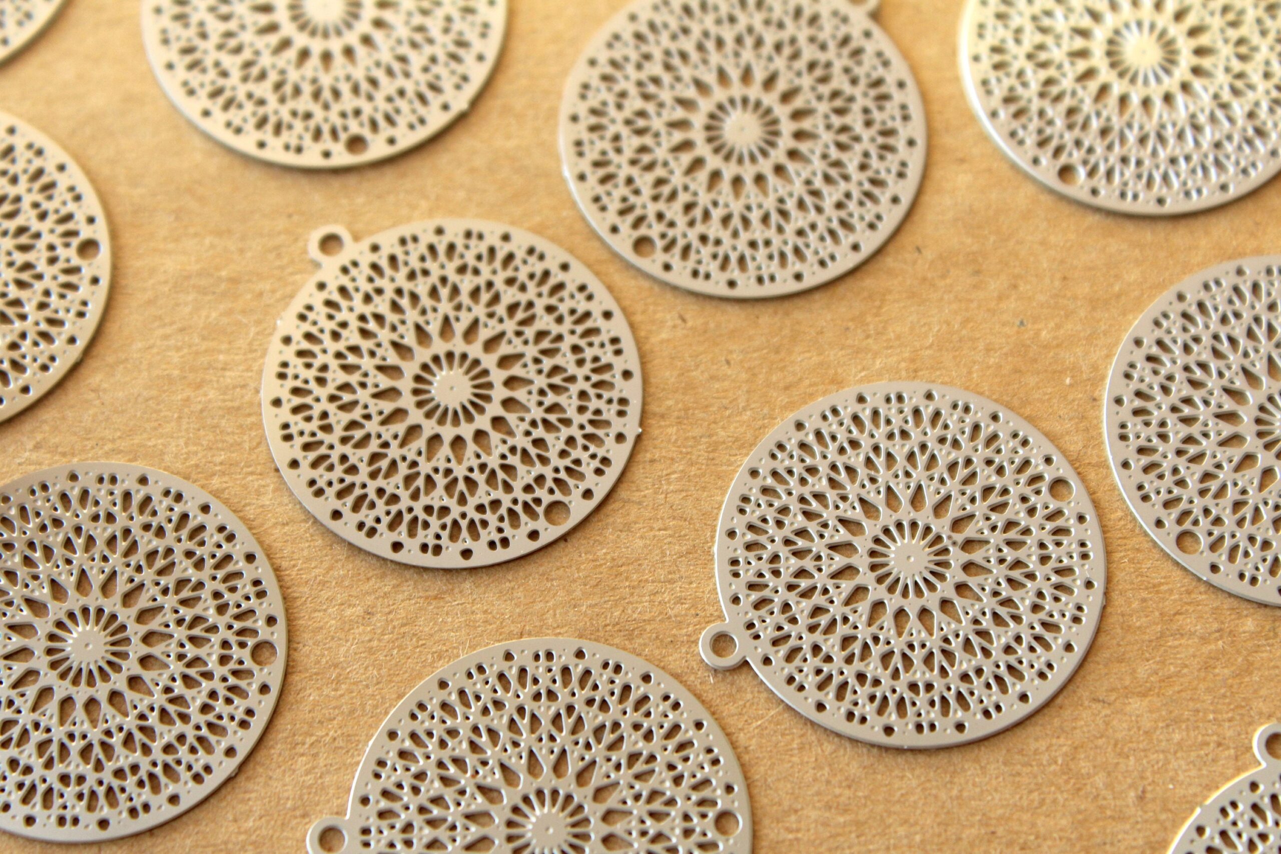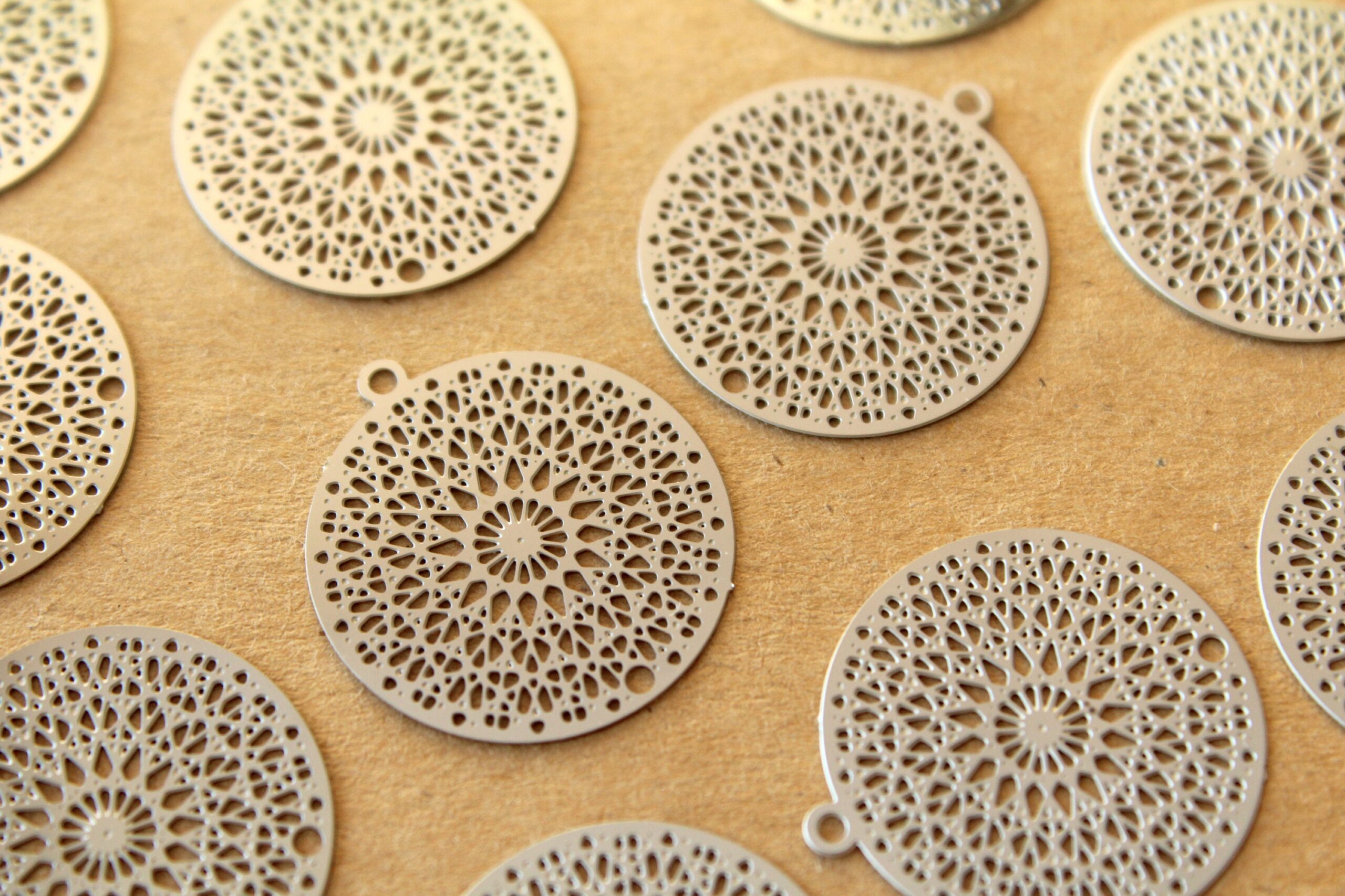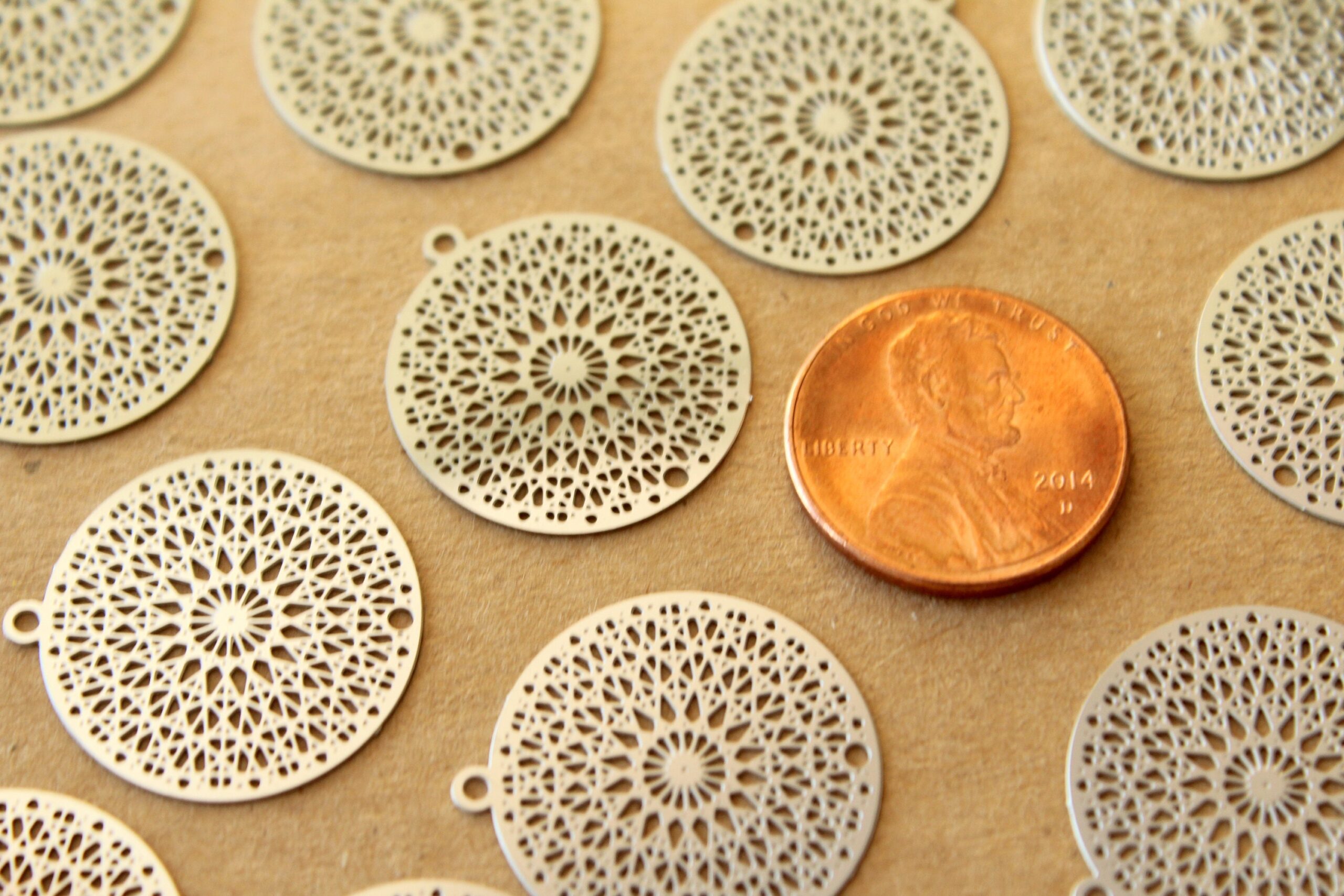 Brass laser cut circle filigree drops with a filigree pattern and one hole.