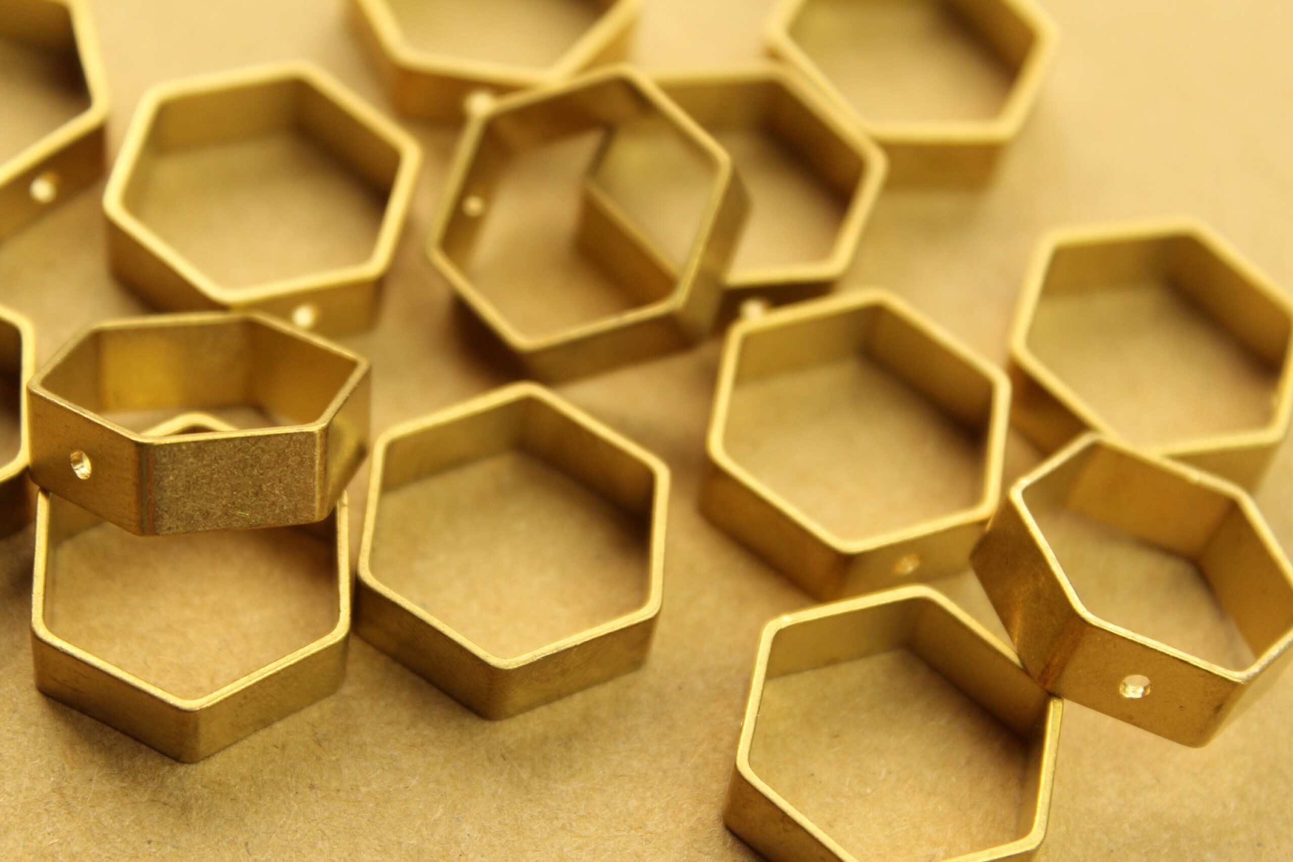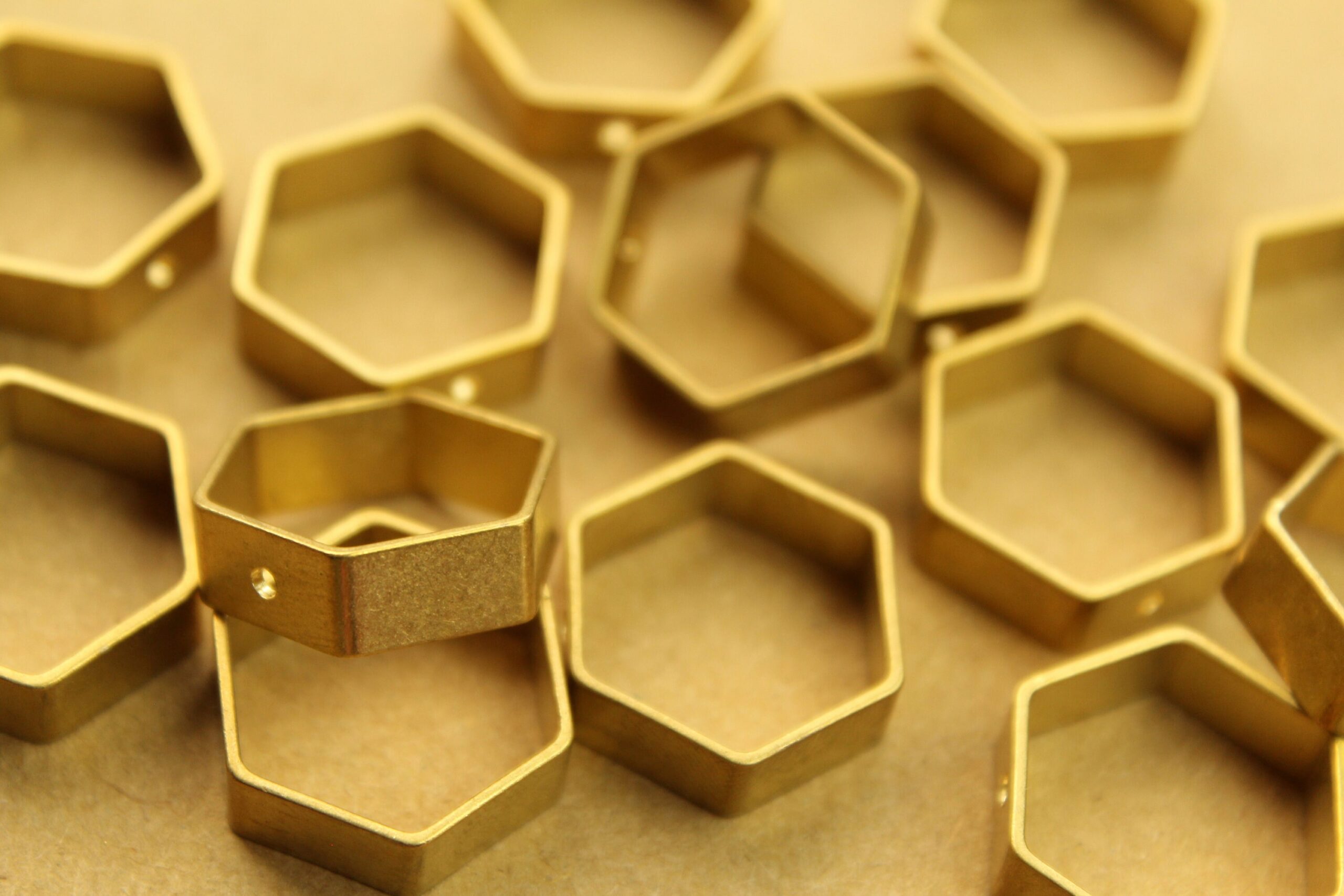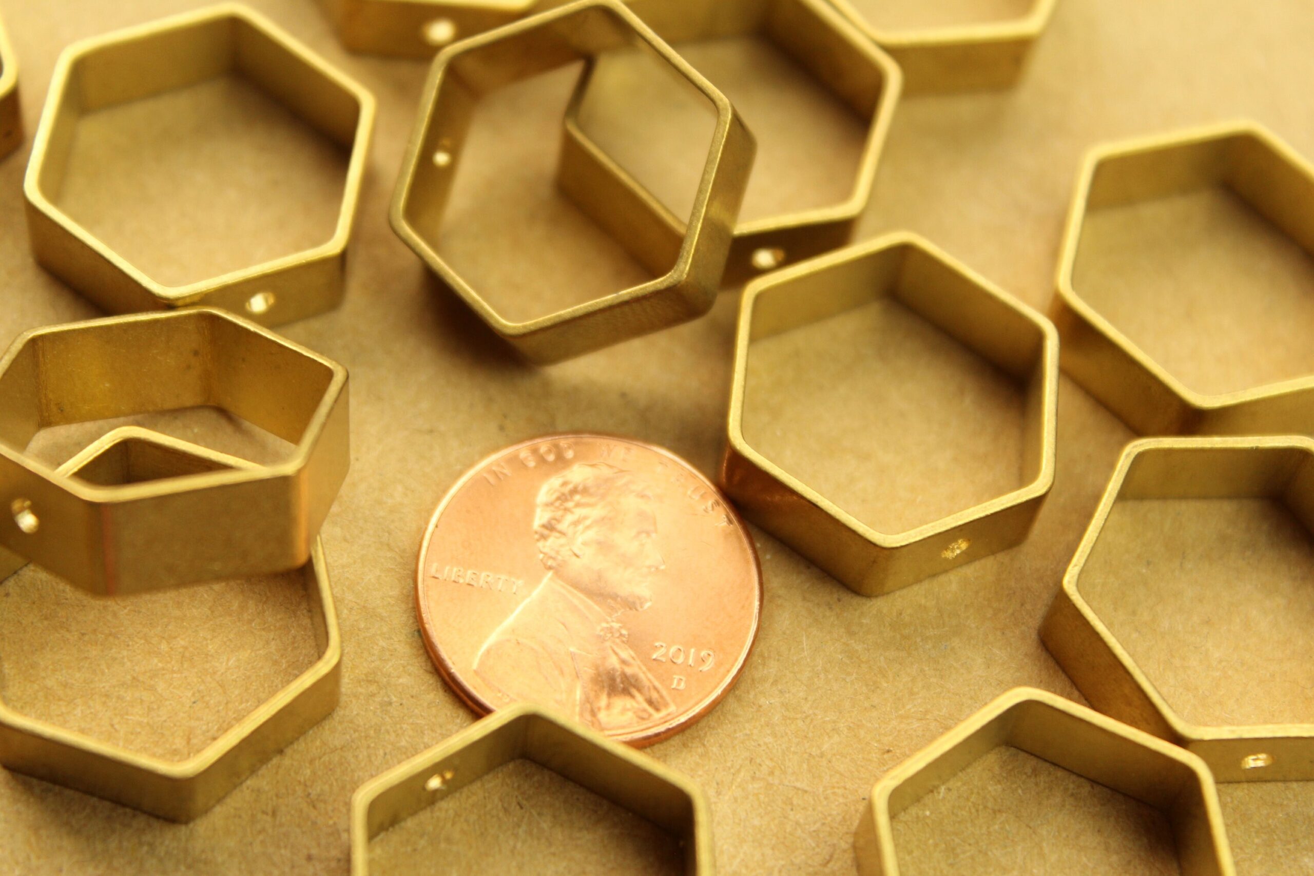 Raw, unplated brass hexagon charms. These have one hole in the ring to thread a headpin. Nickel, lead and cadmium free.