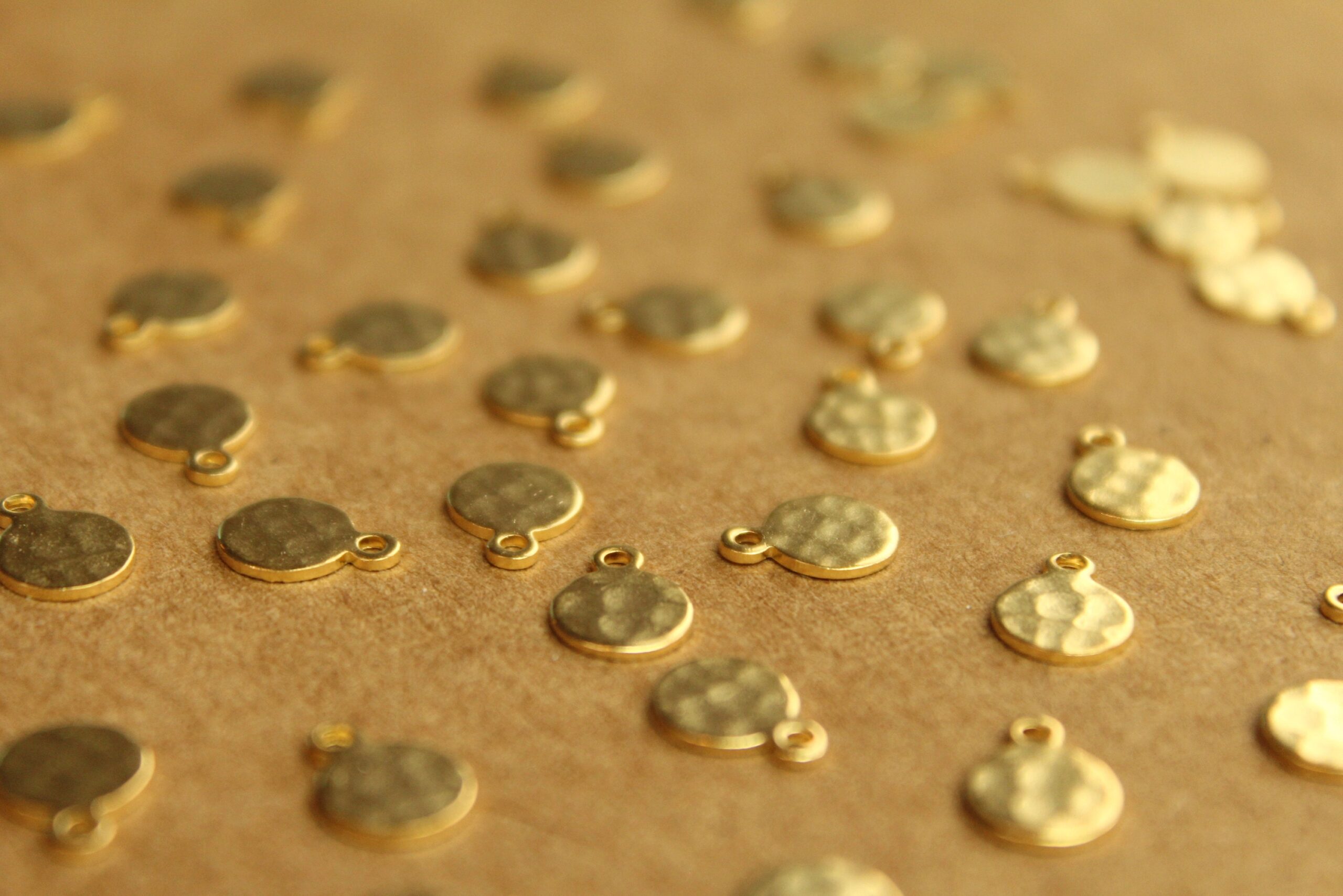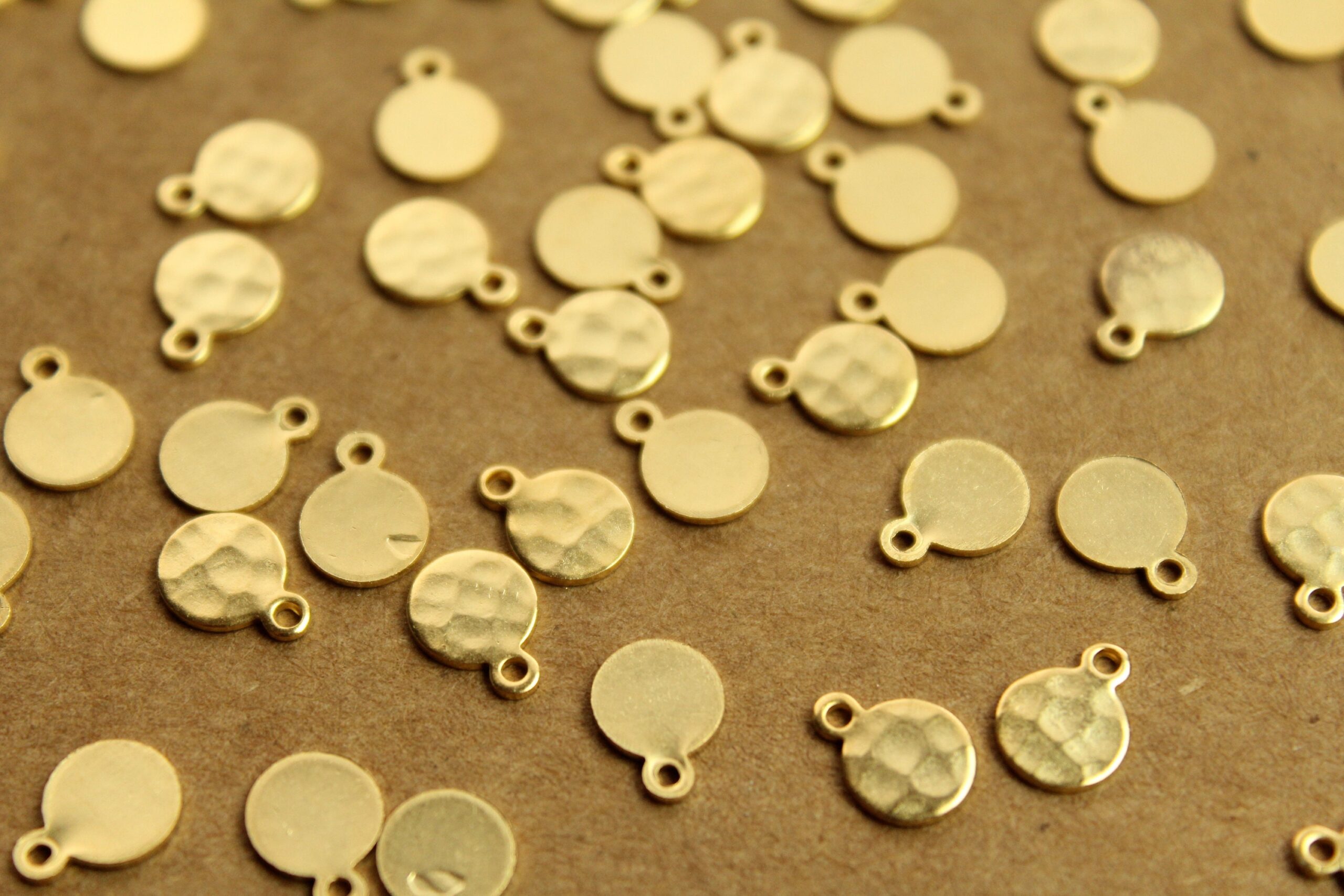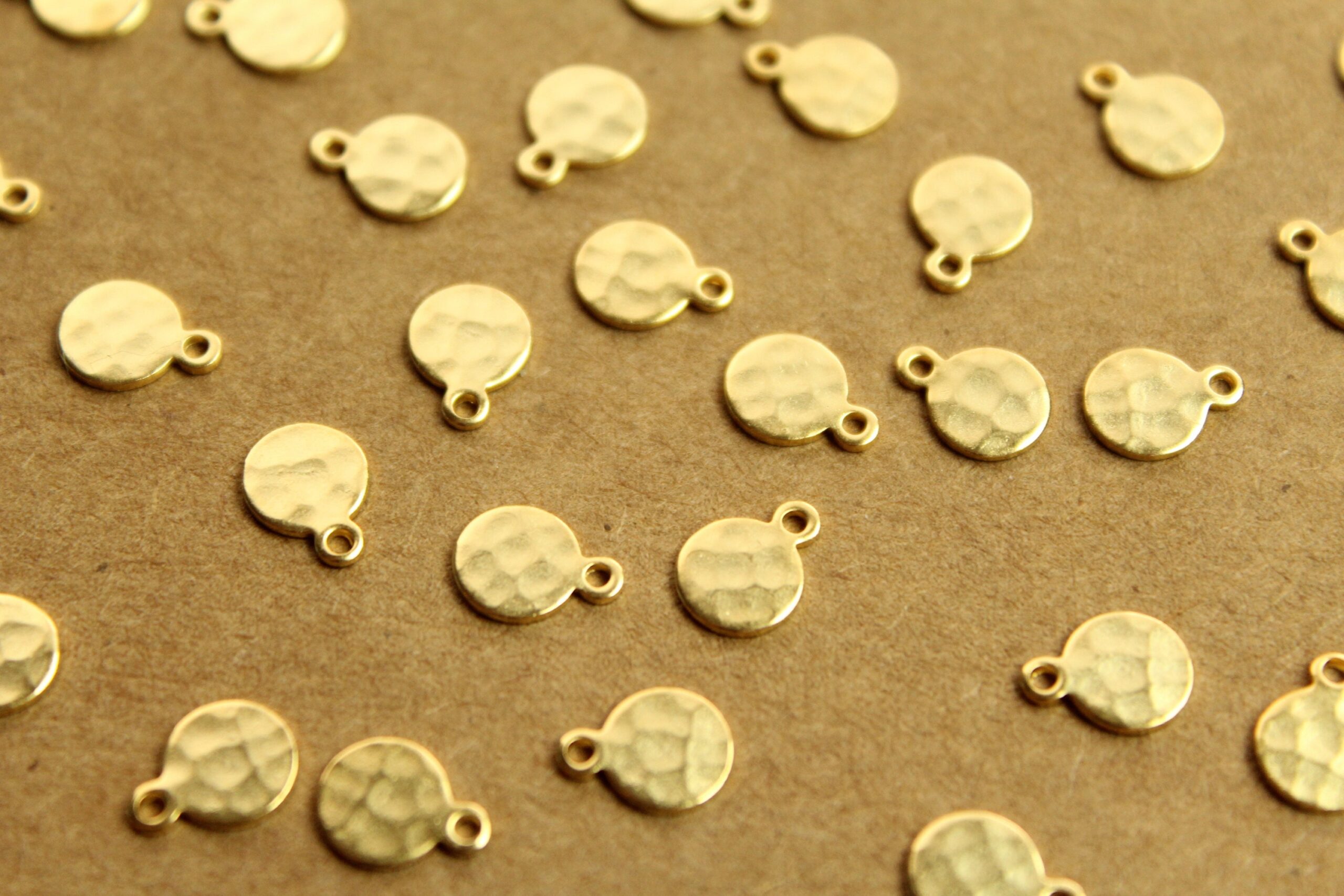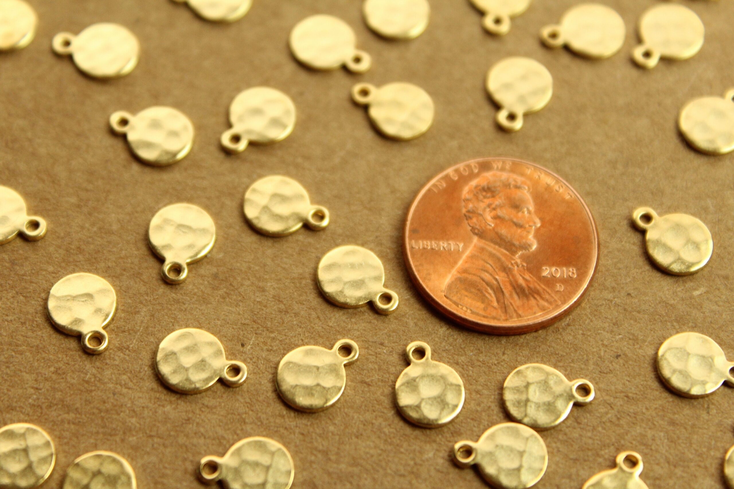 Small brass hammered circle tags with flat backs made in the USA.