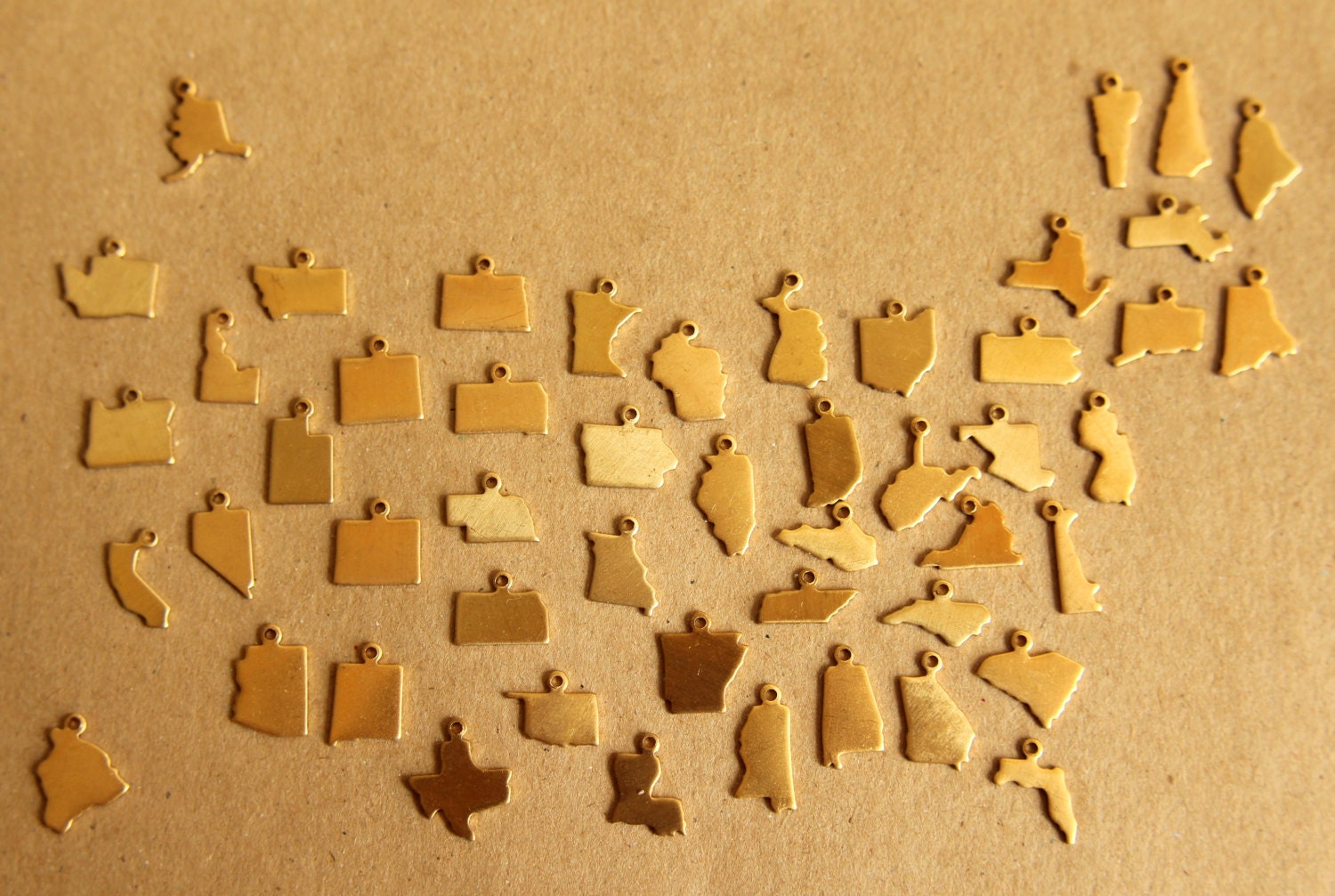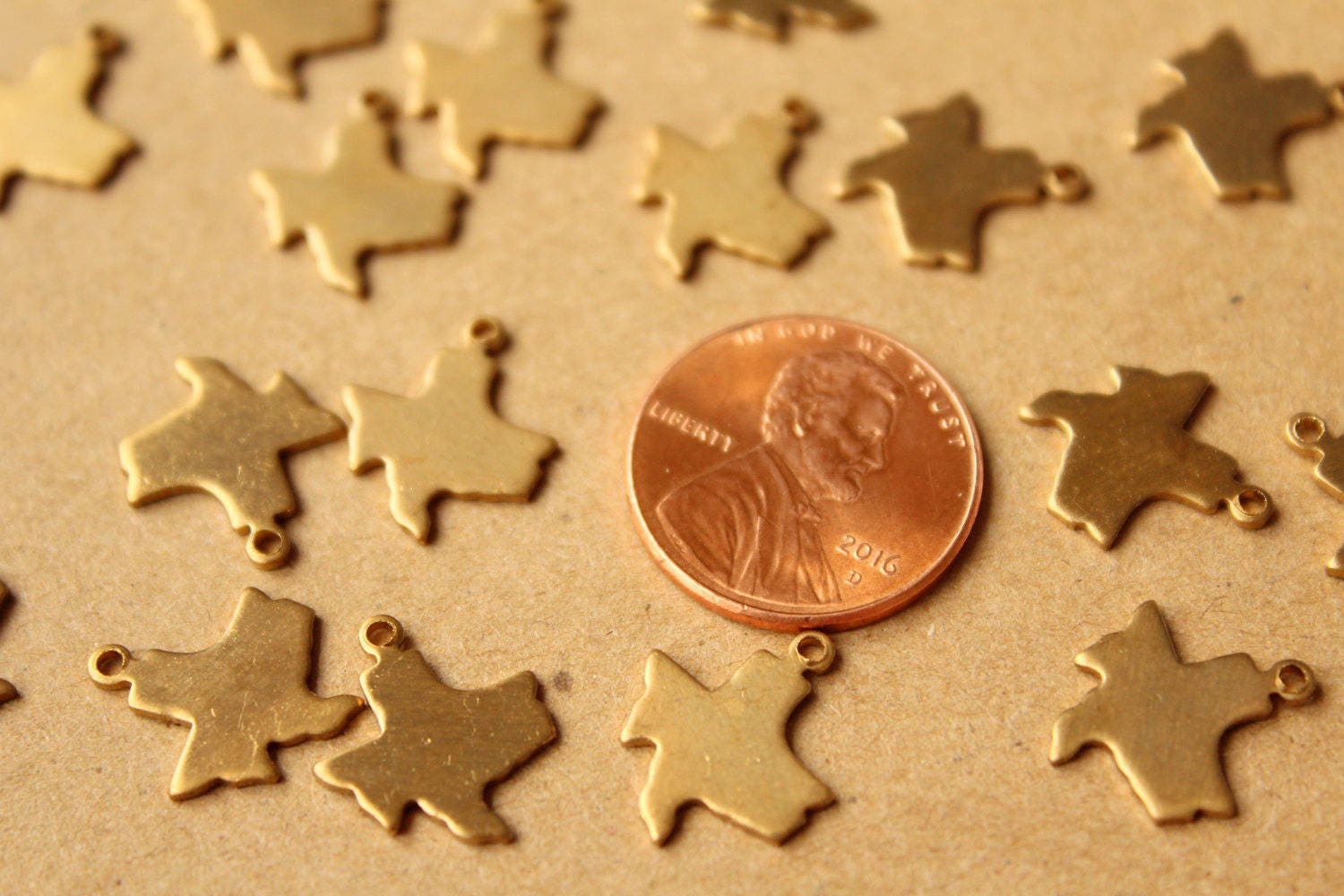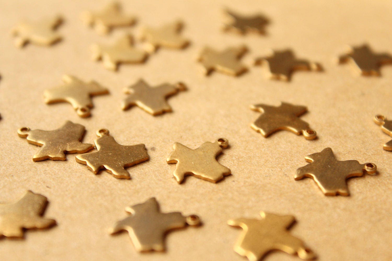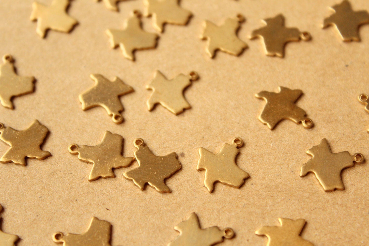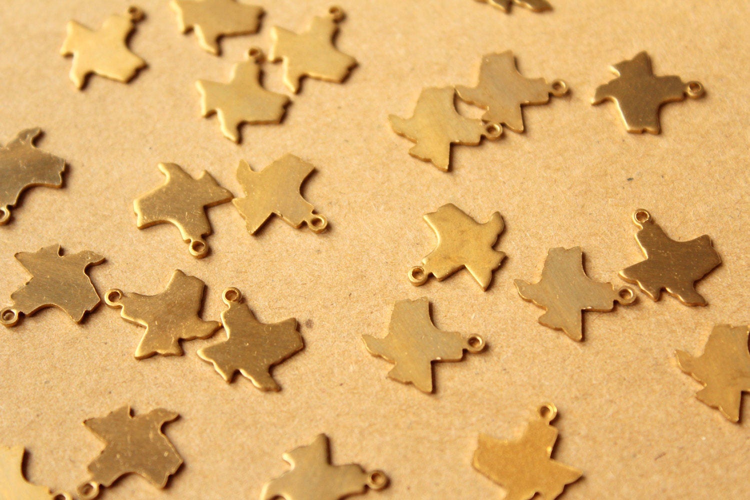 Small raw brass Texas state charms with flat backs made in the USA.