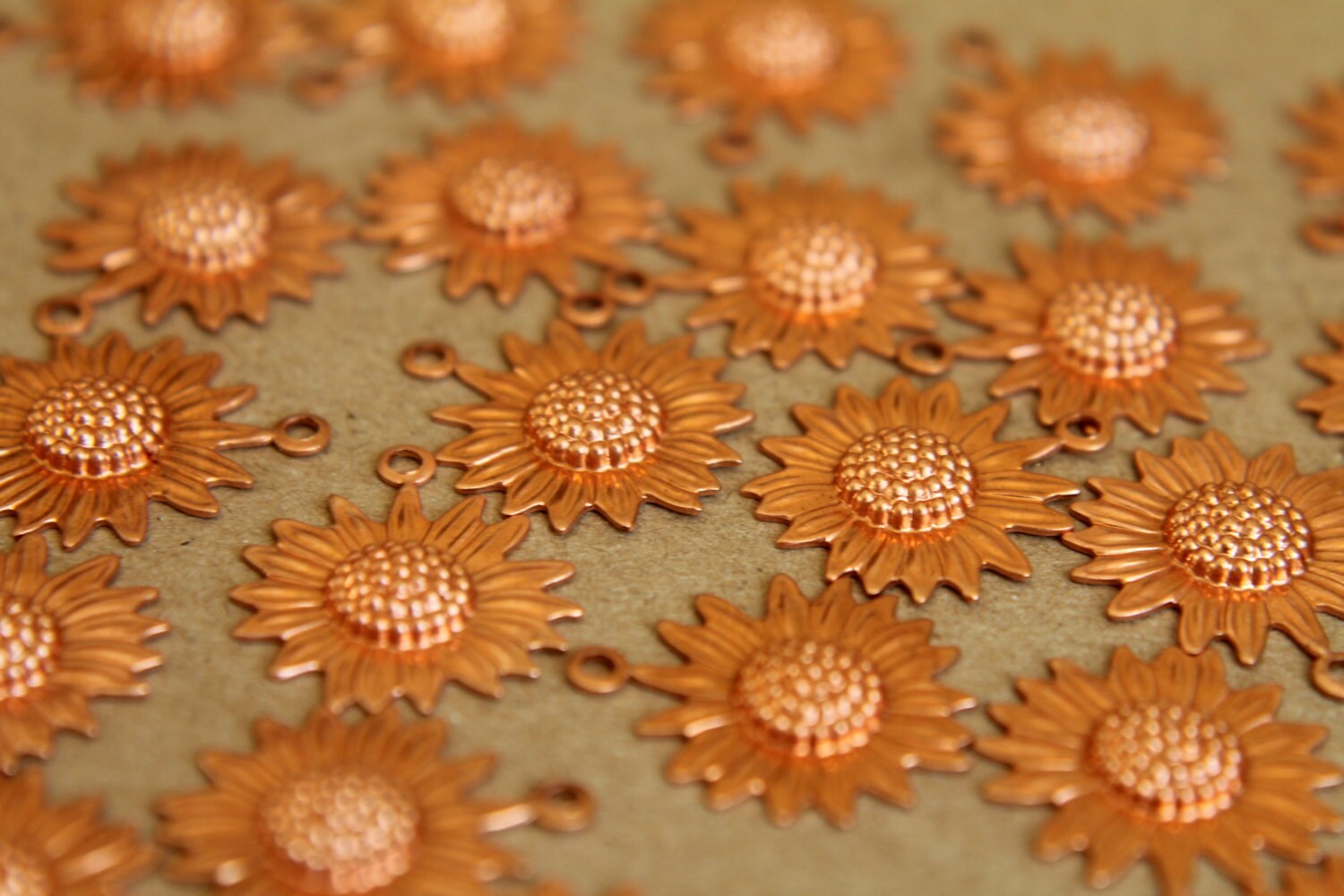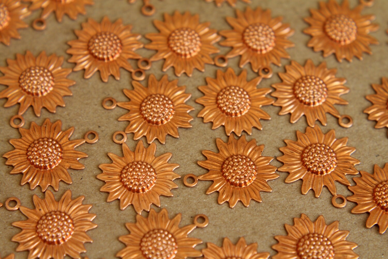 Pretty raw copper sunflower charms. These have hollow backs and one loop.