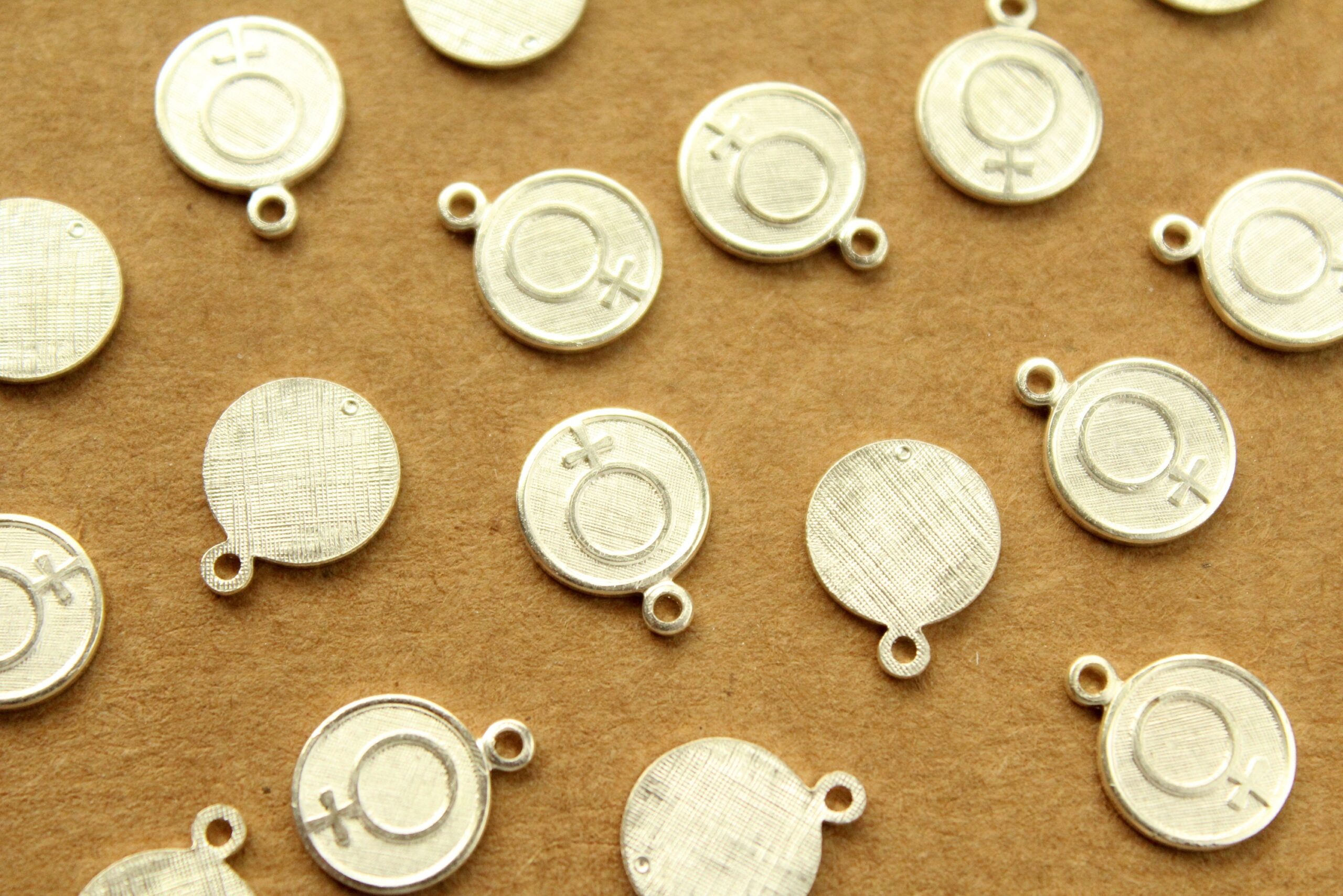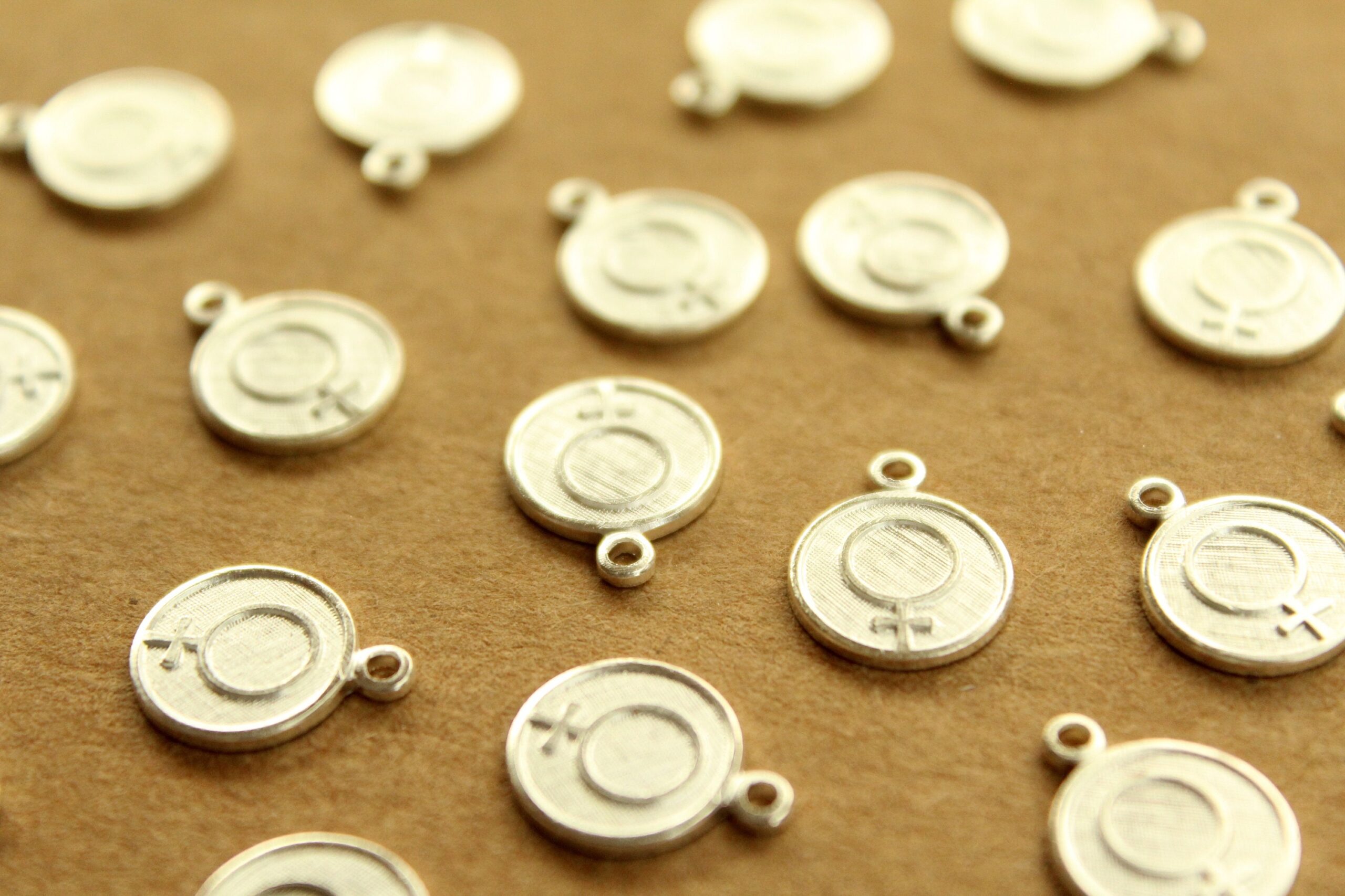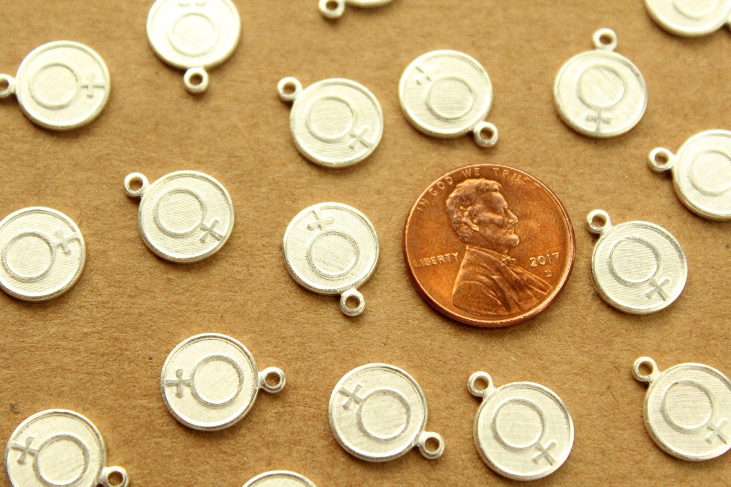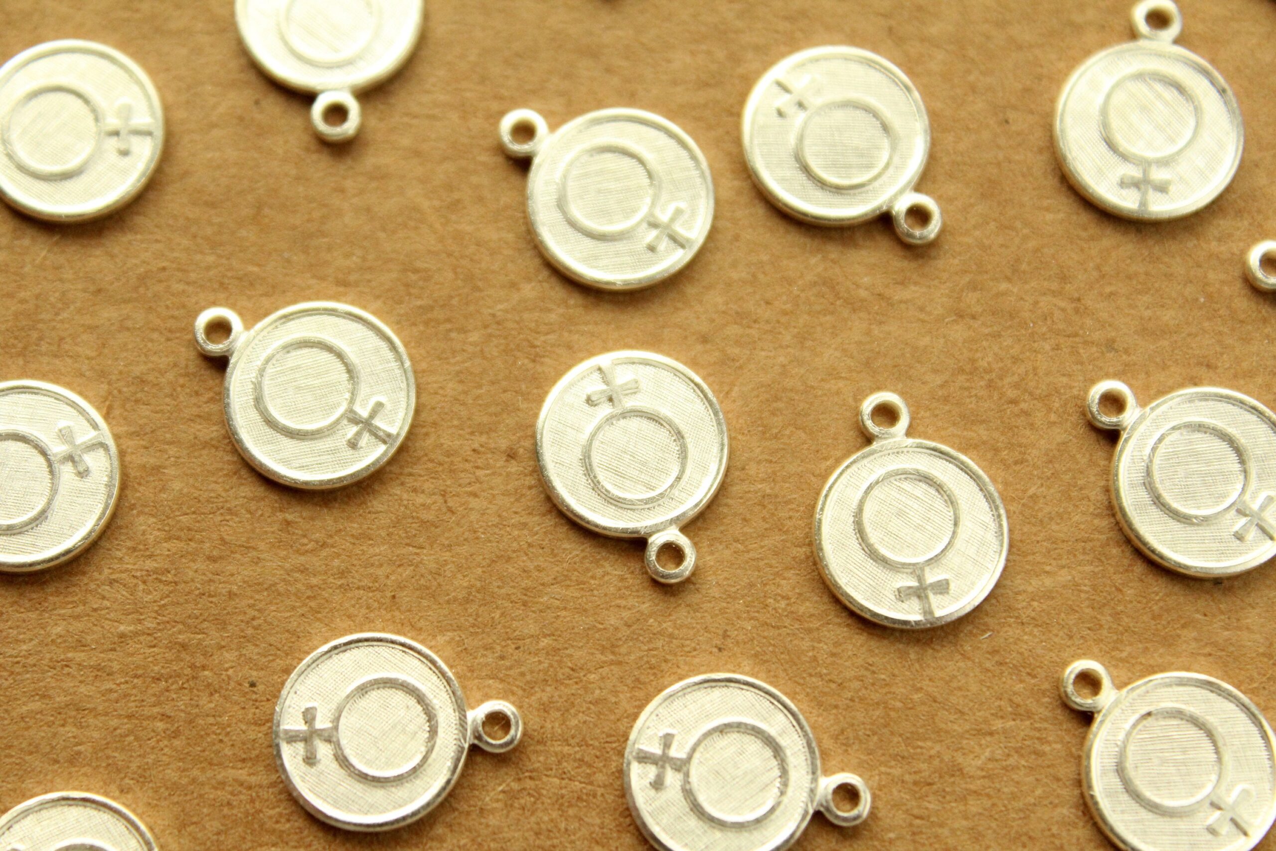 Brass female symbol coin charms with flat backs made in the USA.