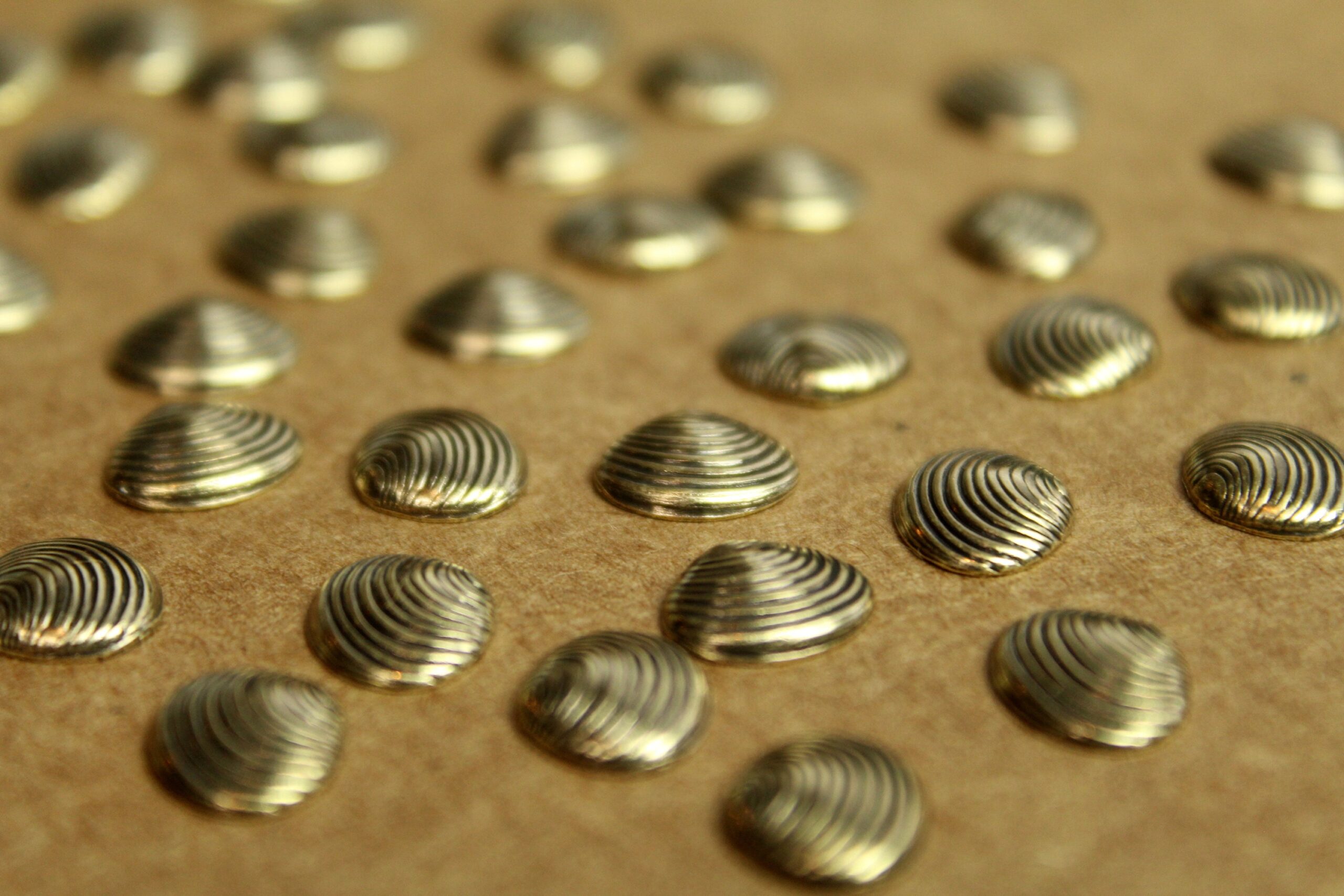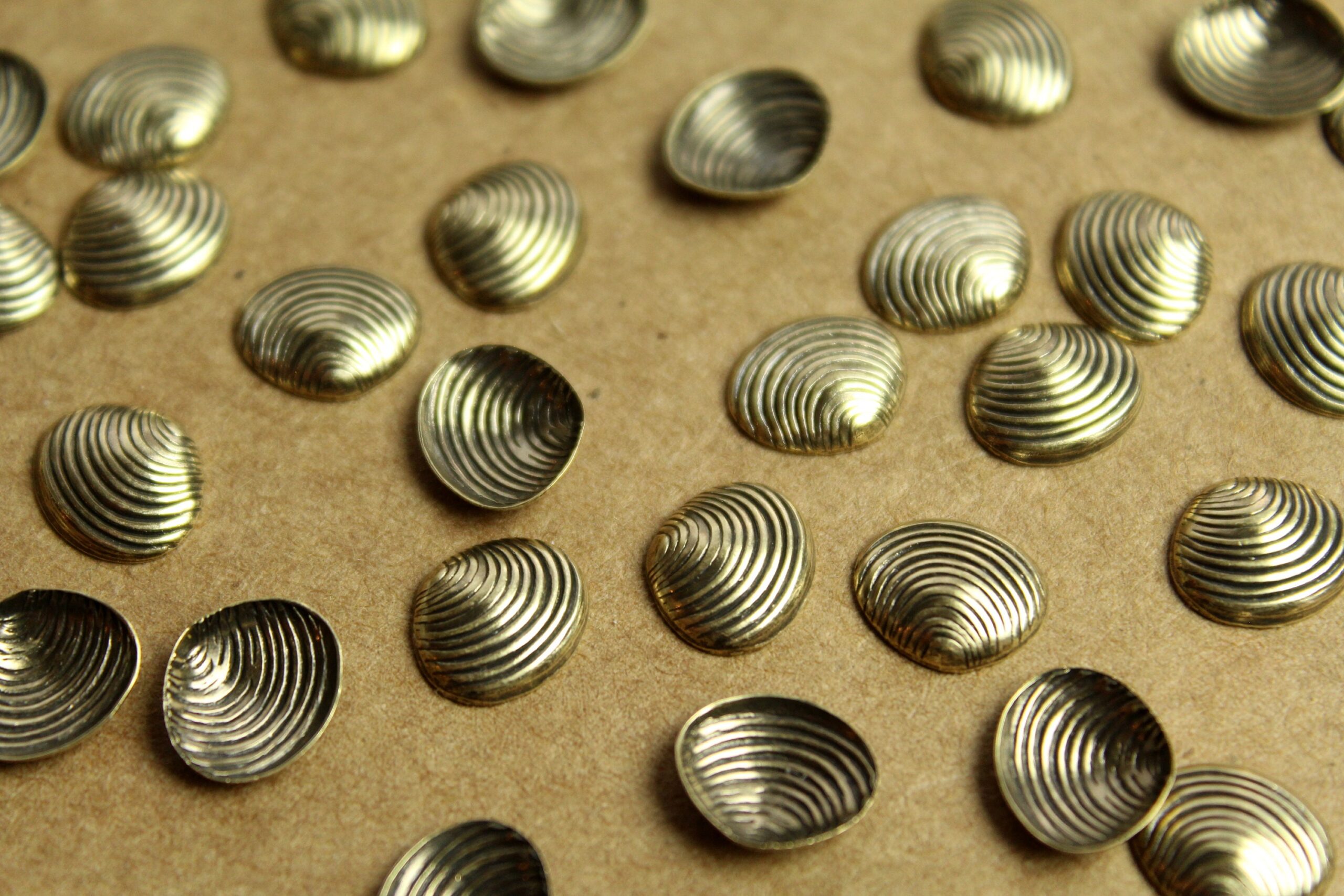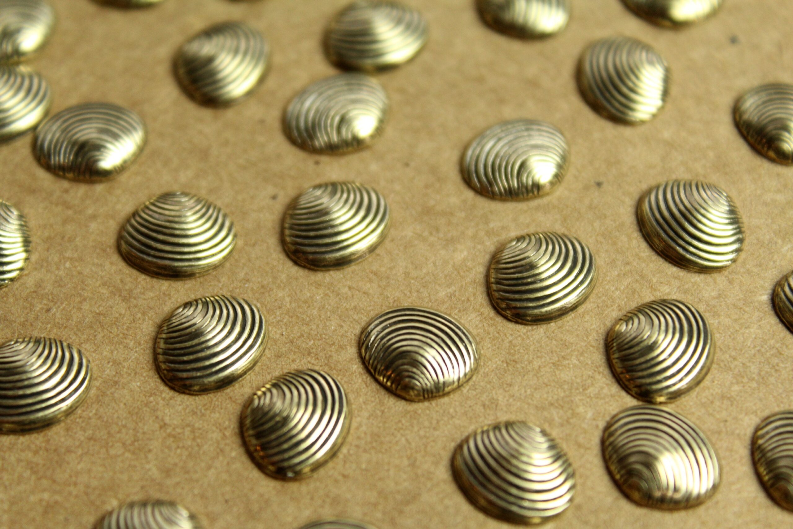 Tiny brass clam shell stampings with hollow backs made in the USA.